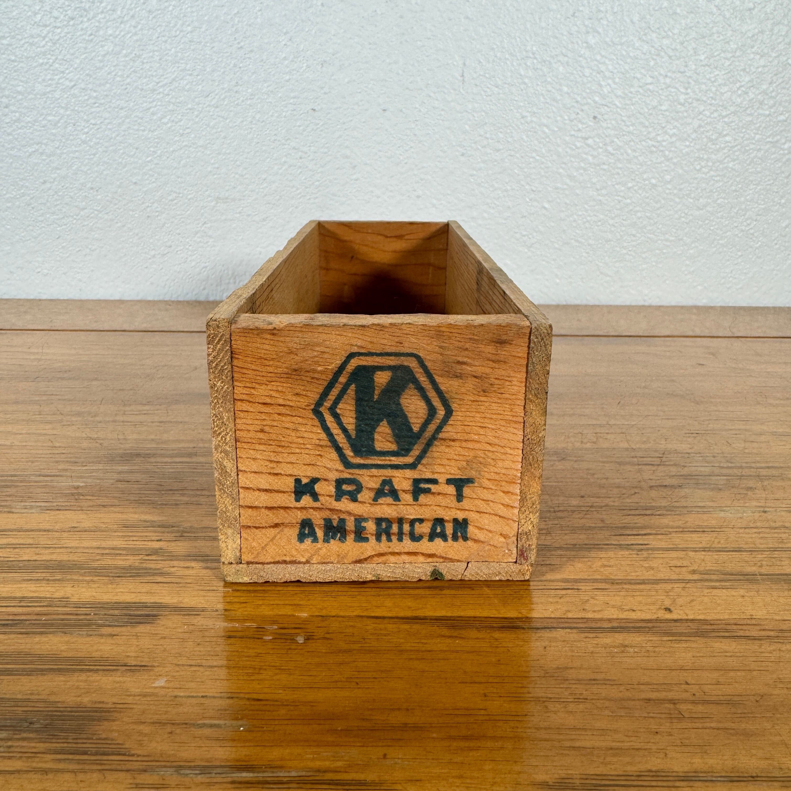 アメリカの老舗チーズブランド「KRAFT」のロゴがプリントされた、雰囲気たっぷりのウッドボックスです。かつて実際にチーズの梱包に使われていた業務用パッケージで、**「KRAFT AMERICAN」**のレトロなロゴや「2 POUNDS NET」「CHICAGO, ILL」の文字が時代を感じさせます。