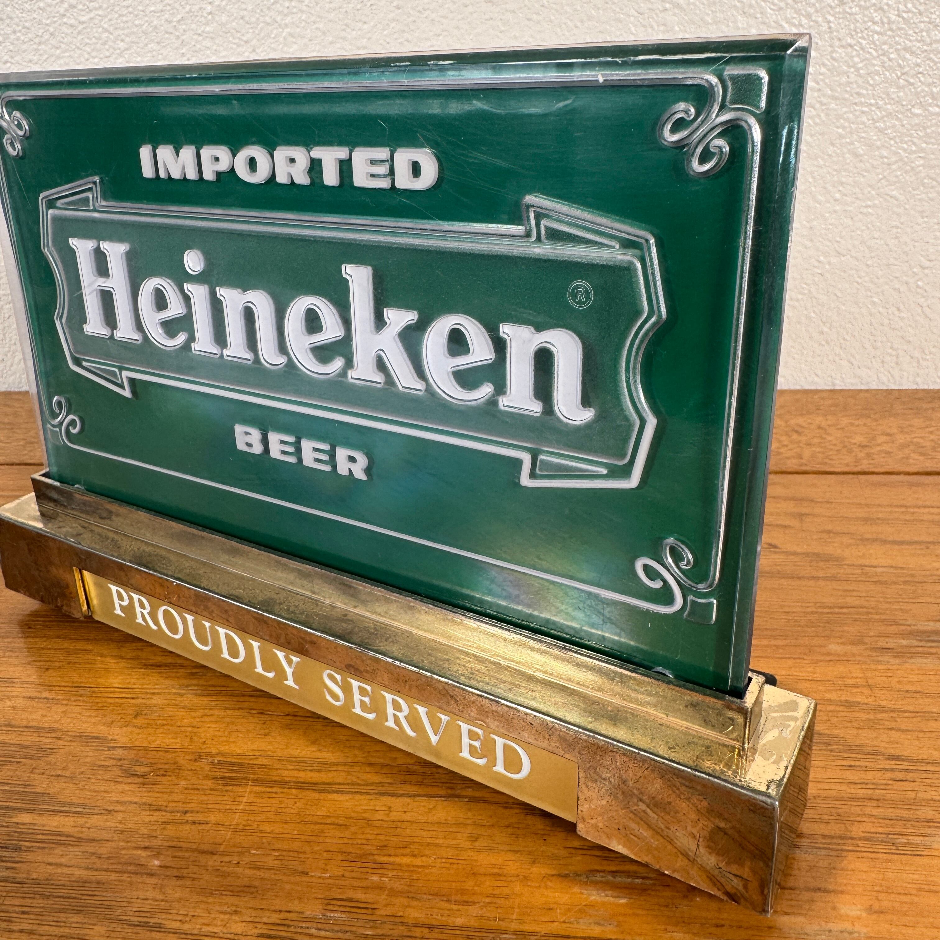グリーンのアクリルプレートに刻まれた「Heineken」のロゴと、下部に灯る「PROUDLY SERVED」の文字。シンプルながら重厚感あるデザインが目を引く、ハイネケンのライトサインです。