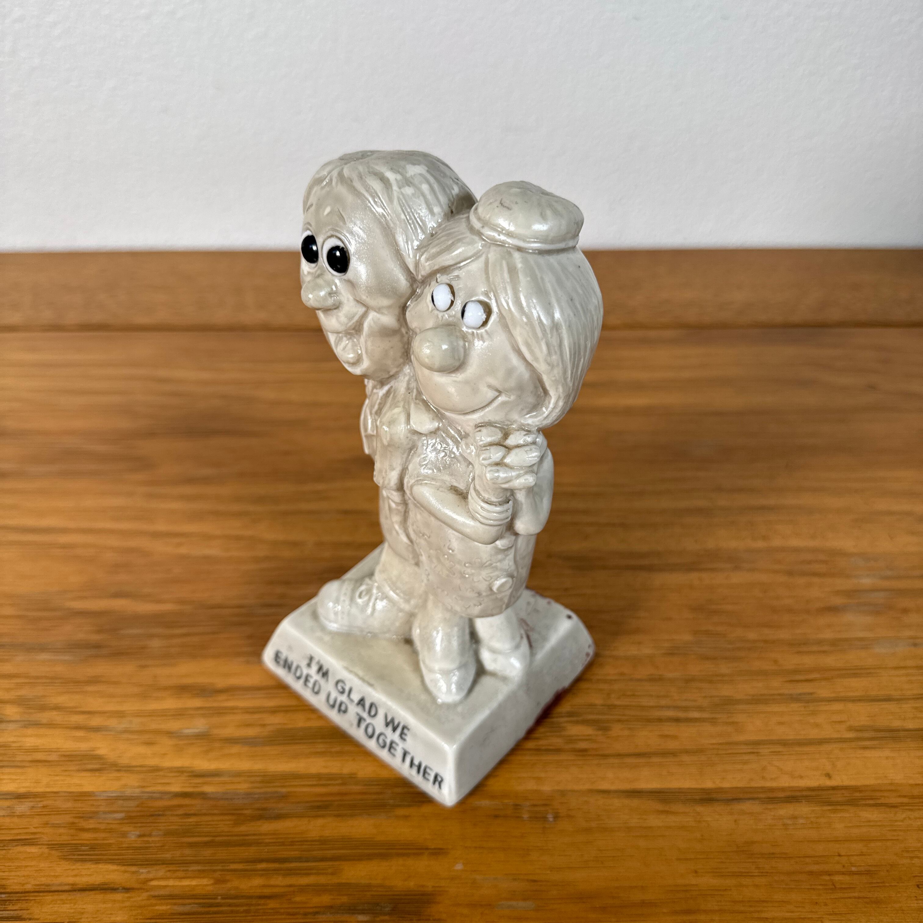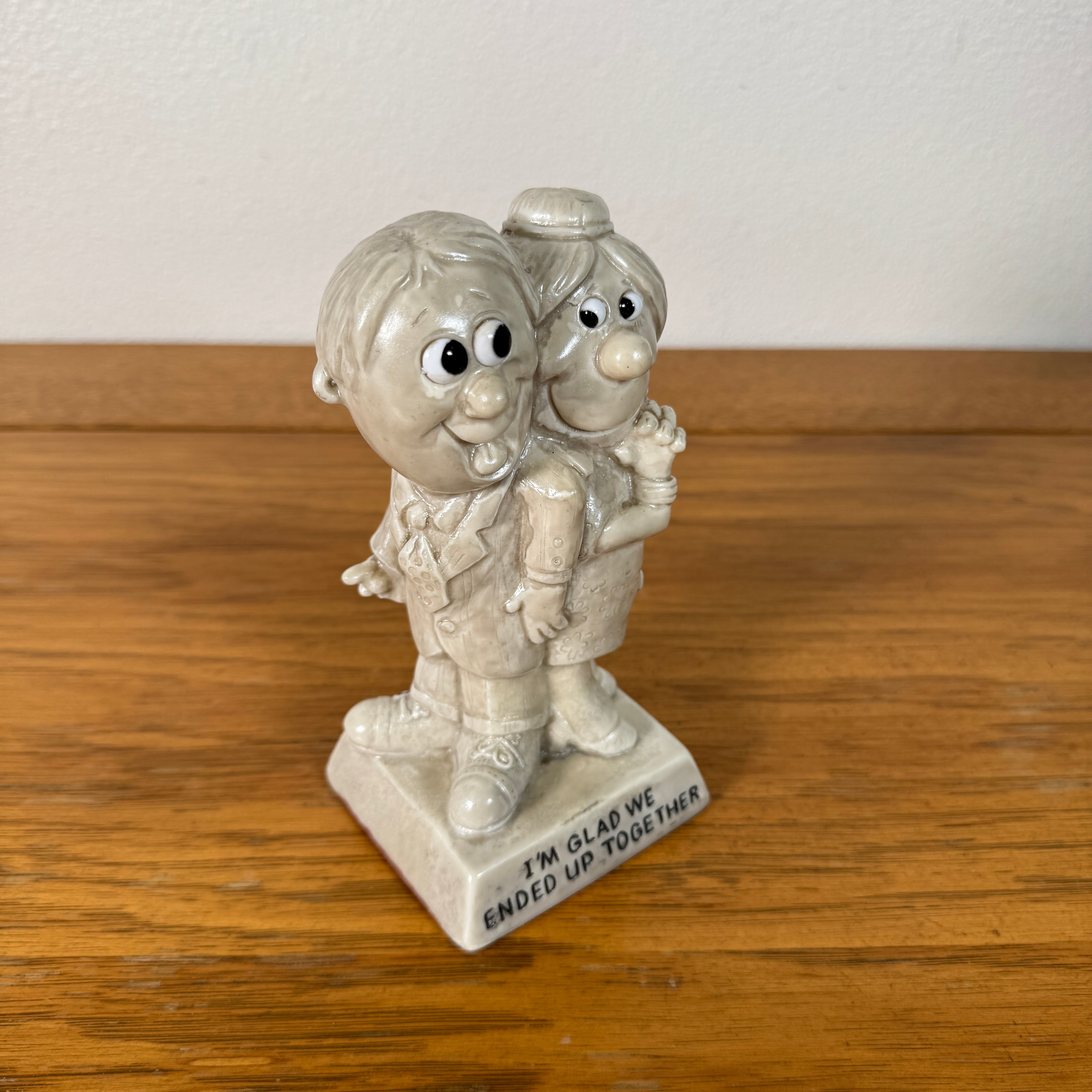 アメリカのR&W Berries Co.より1971年に製造された、愛らしいカップルのメッセージドールです。“I'M GLAD WE ENDED UP TOGETHER(あなたと一緒になれてよかった)”のメッセージが台座に描かれた、心温まる一品です。