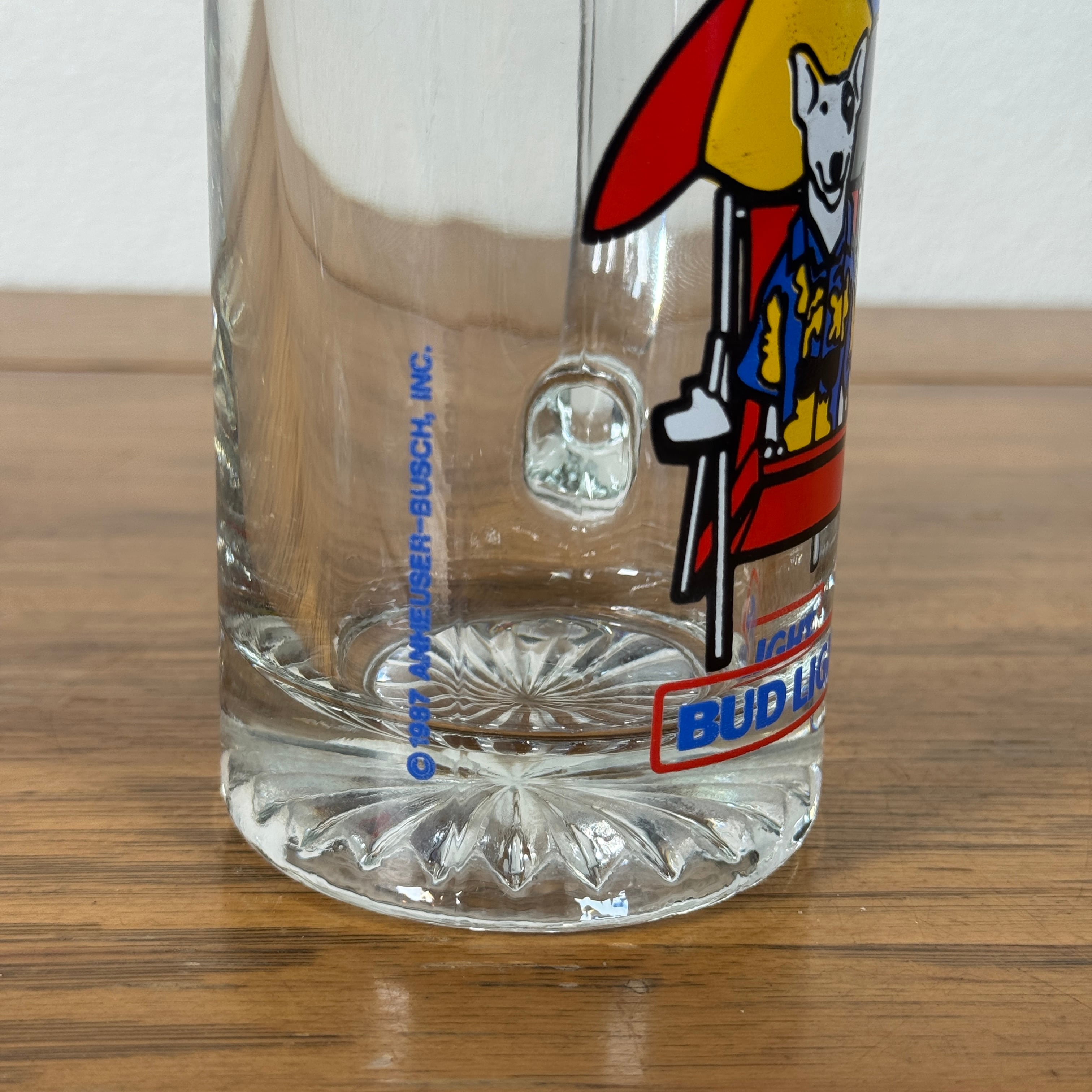 アメリカのビール文化を象徴するキャラクター、スパッズ・マッケンジーが描かれたBud Lightのビンテージジョッキグラスです。1987年にAnheuser-Busch社よりリリースされたオフィシャルプロモーショングッズで、"The Original Party Animal"のキャッチフレーズと共に、トロピカルシャツを着てビーチチェアでくつろぐスパッズの姿が愛嬌たっぷりに描かれています。