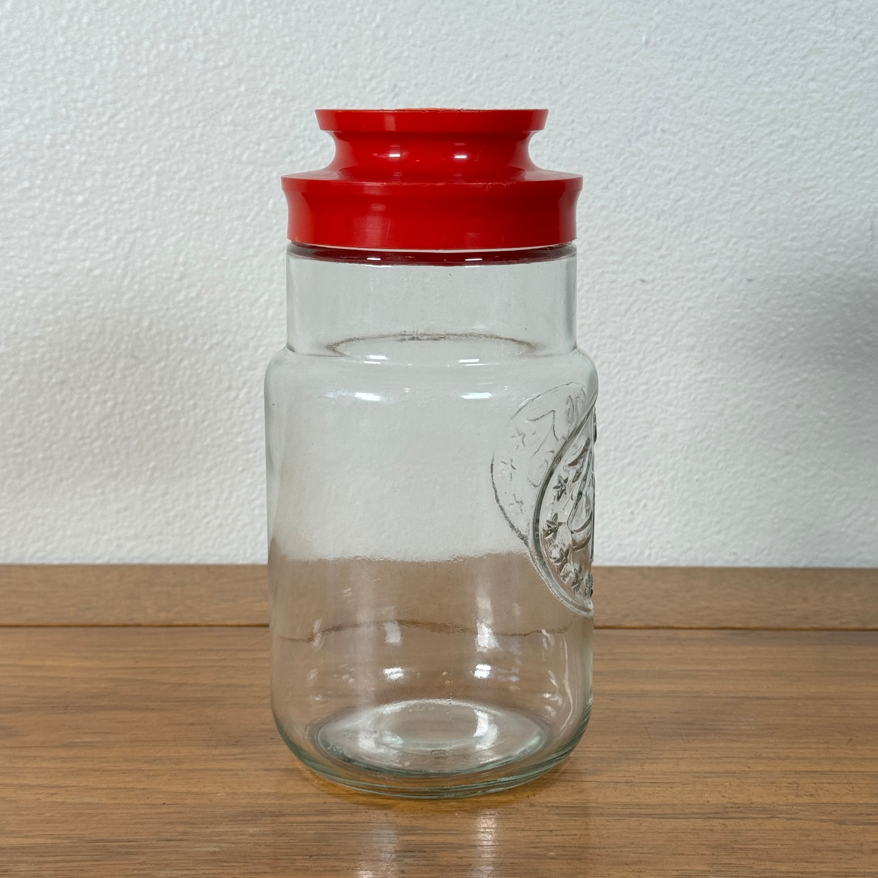 ガラス本体には星条旗やスターのモチーフも浮き彫りで表現されており、正面から見ても横から見ても絵になる存在感。ヴィンテージ感のある厚手のガラスと、レトロな赤いプラスチックキャップのコントラストも魅力的です。