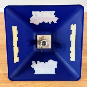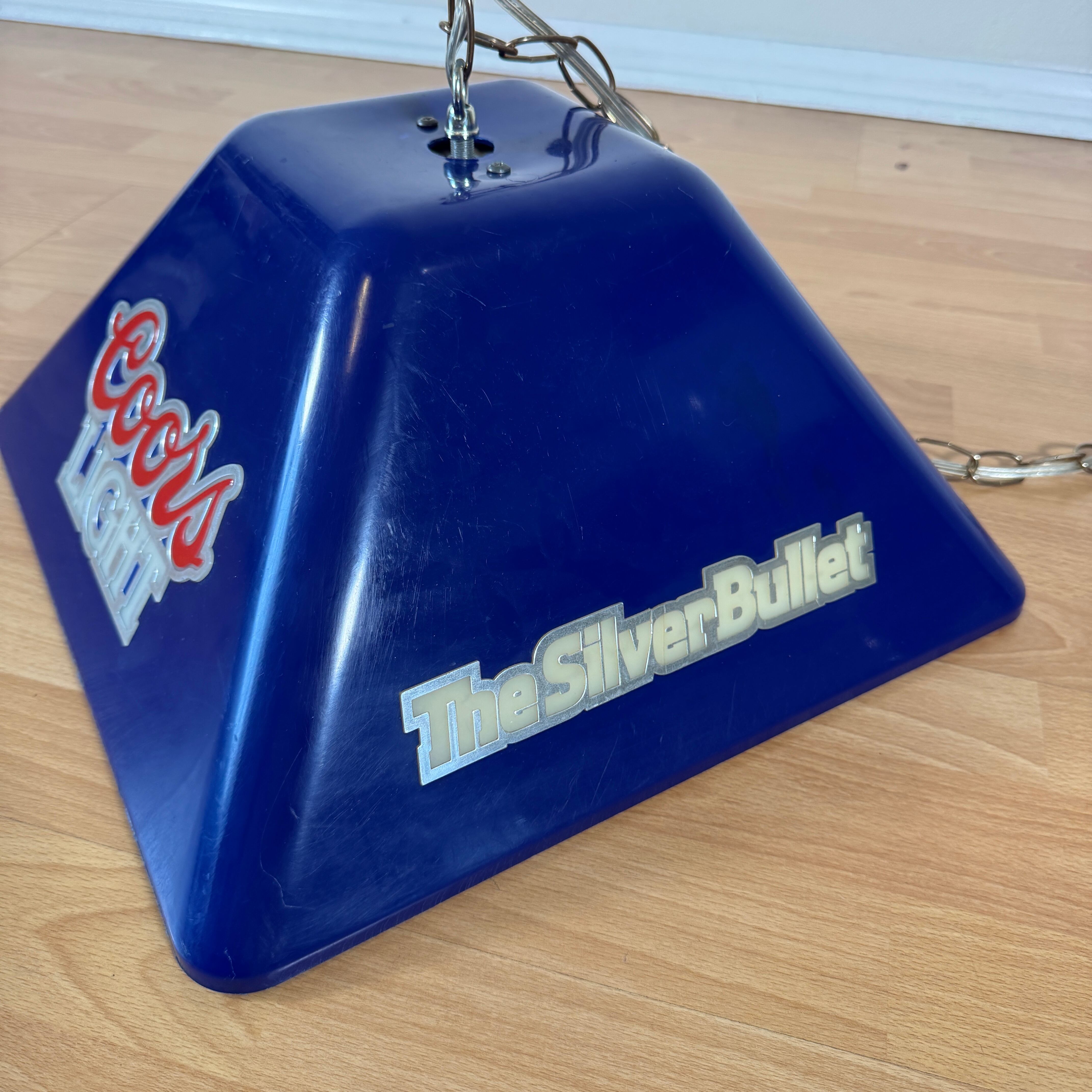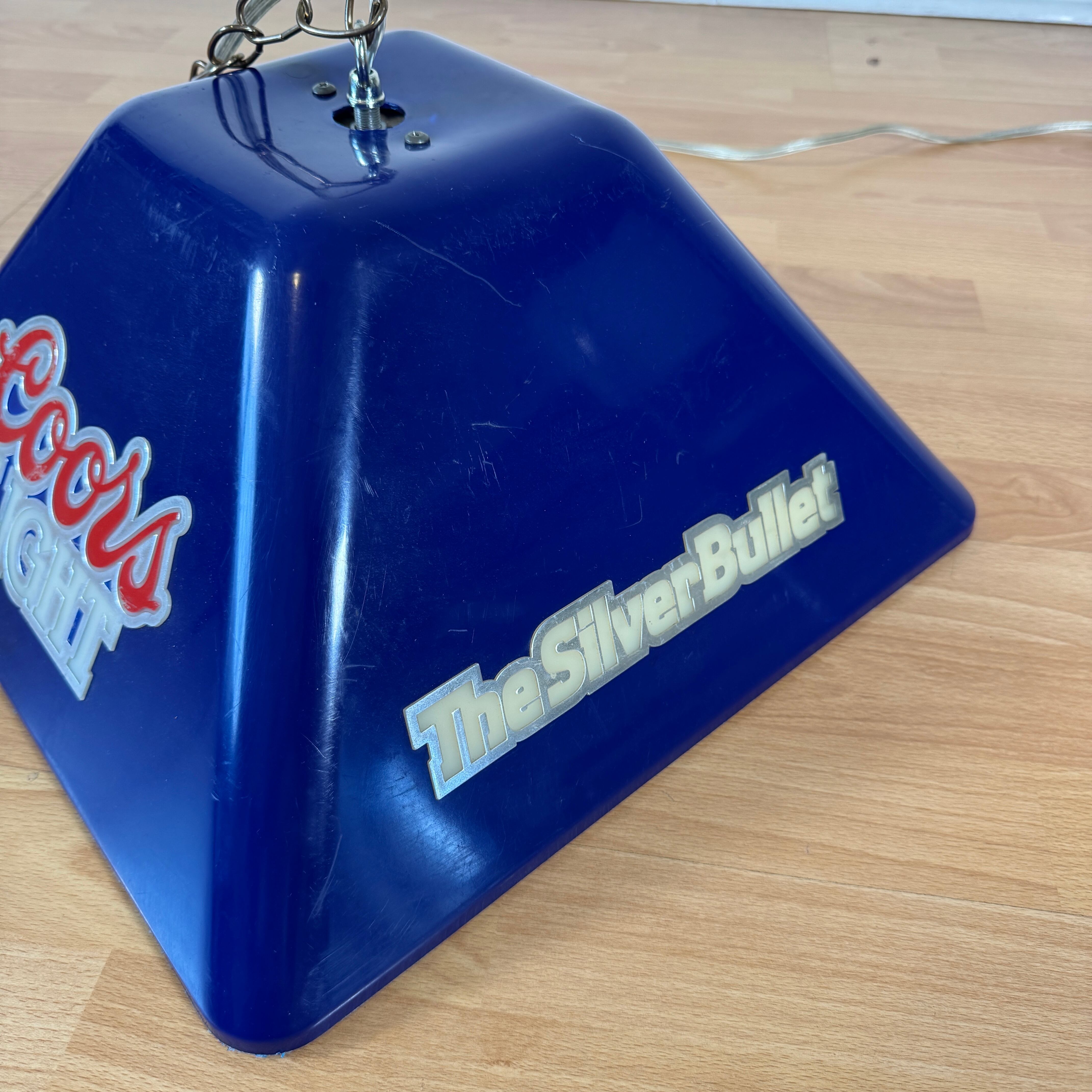 アメリカの人気ビール「Coors Light」のロゴがあしらわれた、ビンテージの吊り下げライトです。深みのあるネイビーブルーのプラスチックシェードに、赤と白の「Coors Light」ロゴが目を引くデザイン。側面には「The Silver Bullet(銀の弾丸)」のキャッチコピーと、列車のシルエットがあしらわれており、ビールの世界観を立体的に表現しています。