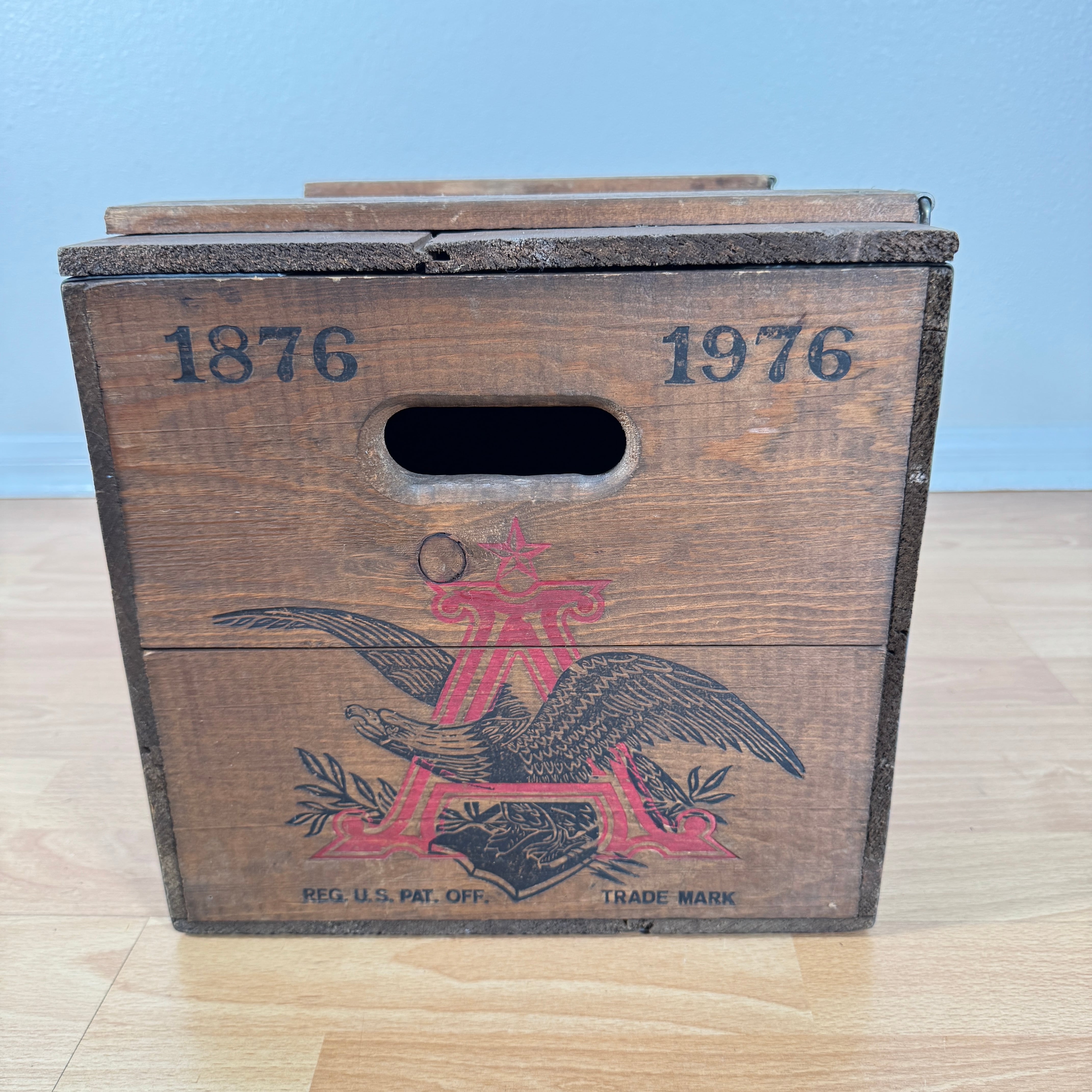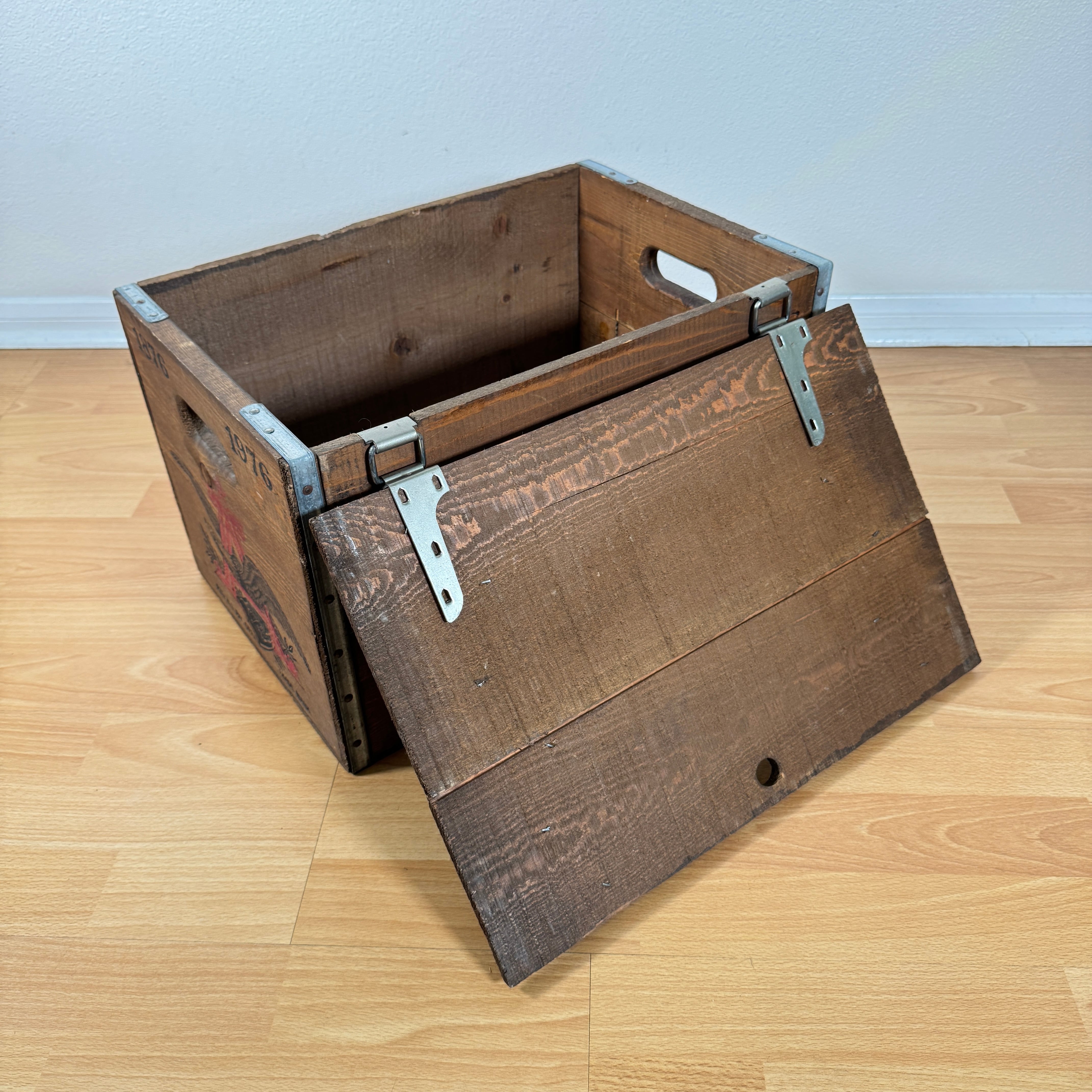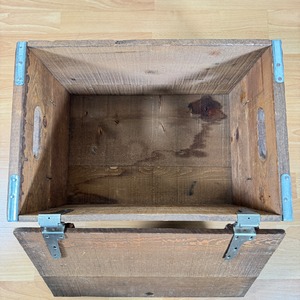 アメリカのバーでは、この木箱にビールが入った状態で配達されていたそうです。持ち運びがしやすいようにサイドには指が入るサイズの穴も空いています。蓋付きなので、ちょっとしたテーブルとしても使えます。