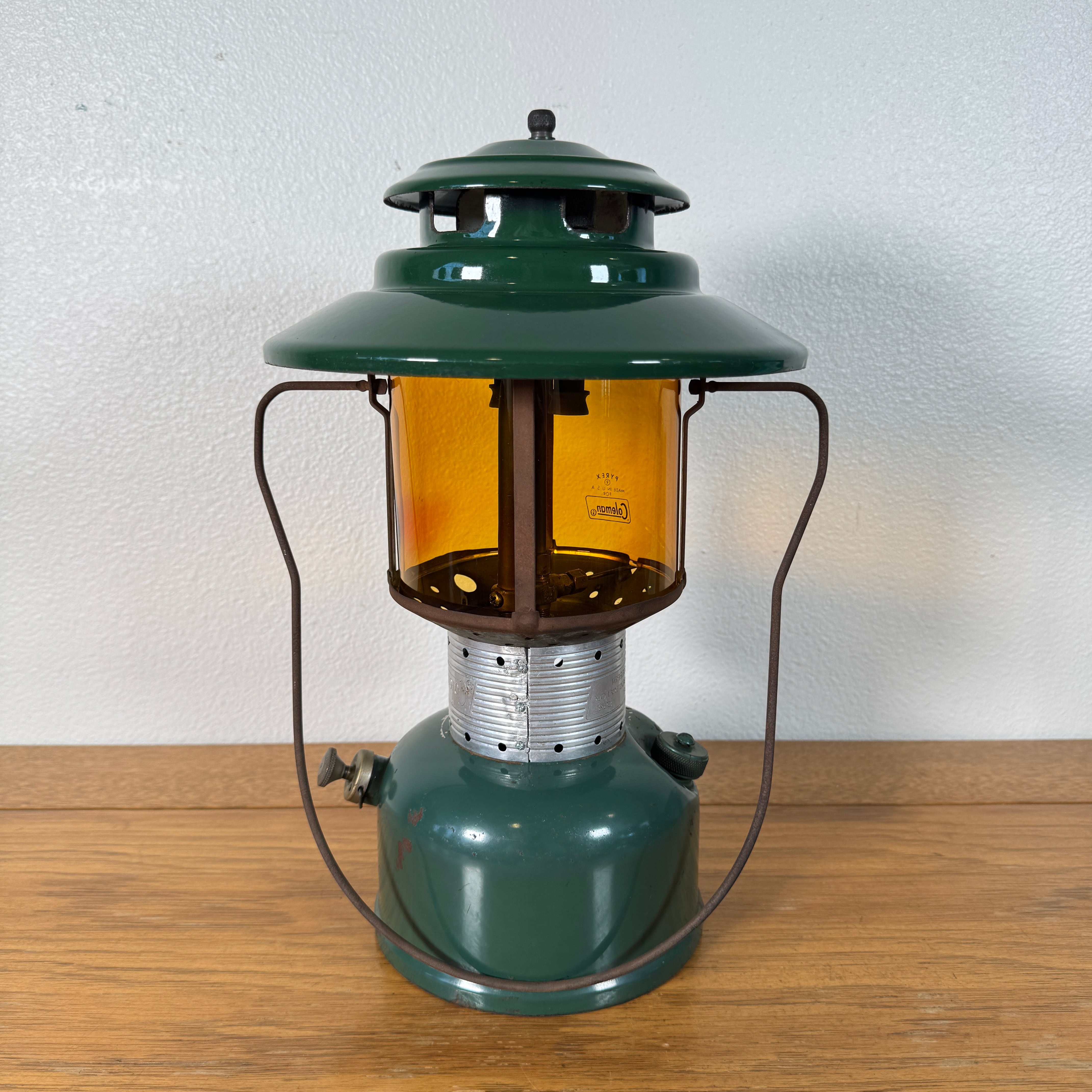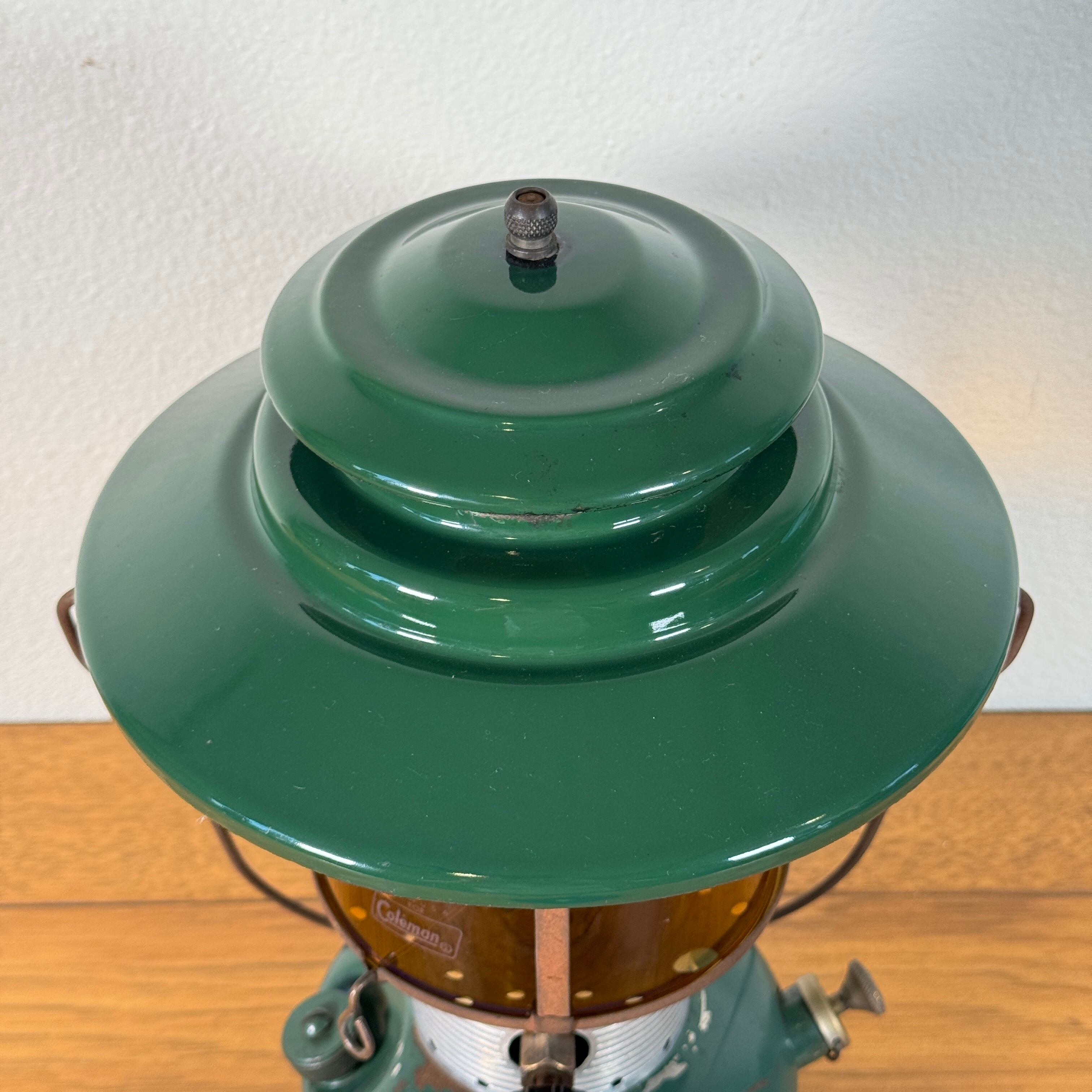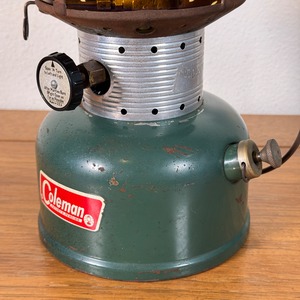 1968年2月製造のコールマン228Fモデル。通称「ビッグハット」の愛称で知られる大型のベンチレーターが特徴で、広い笠が光をやわらかく拡散し、存在感のある佇まいを演出します。
