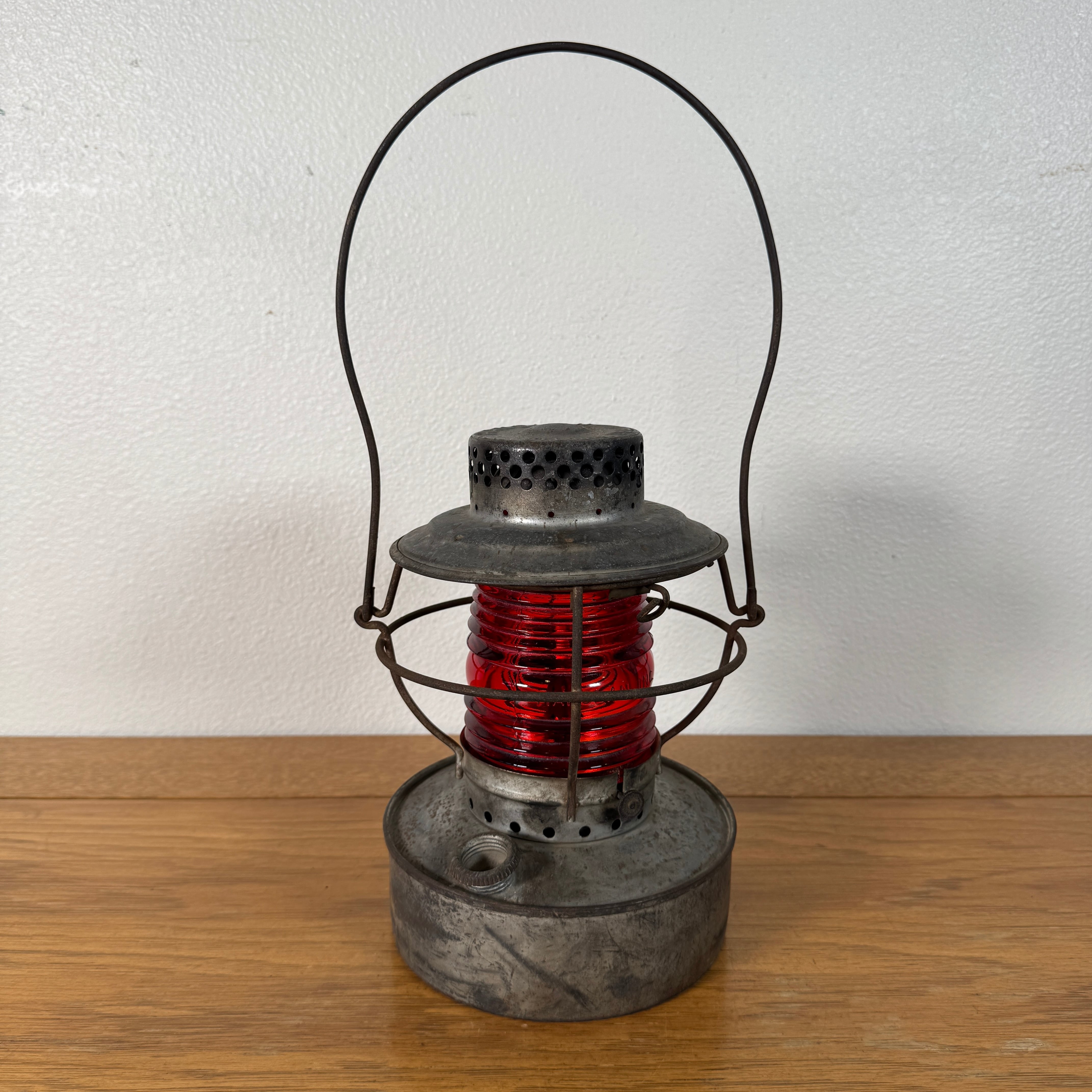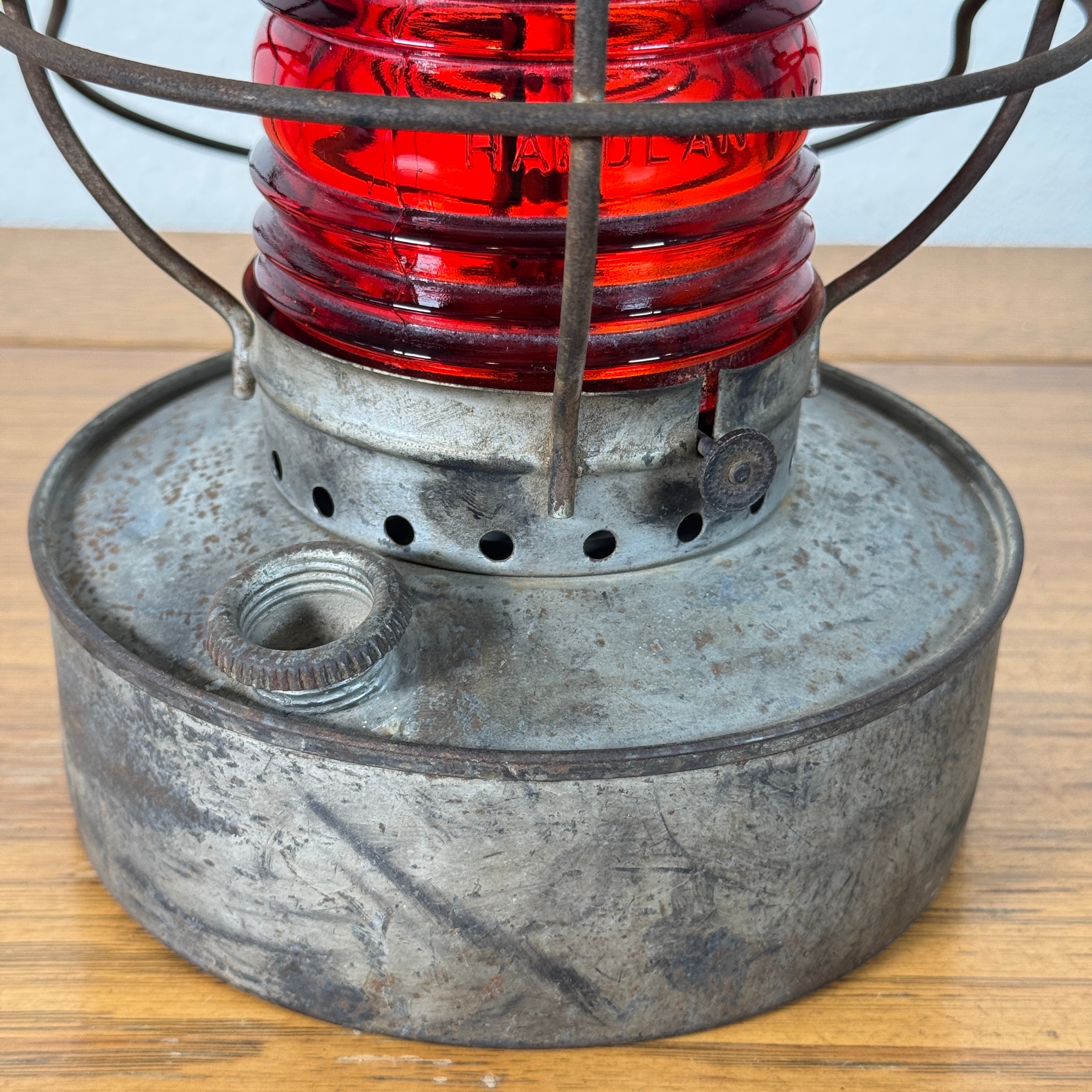 Handlan社はアメリカ・ミズーリ州セントルイスに拠点を置き、鉄道用ランタンやシグナル機器を数多く製造していた老舗メーカーで、その品質と耐久性の高さから長年にわたり鉄道会社に採用されてきました。本品は警告や停止を意味するレッドグローブ仕様で、鉄道現場での安全確保に使用されていたと考えられます。