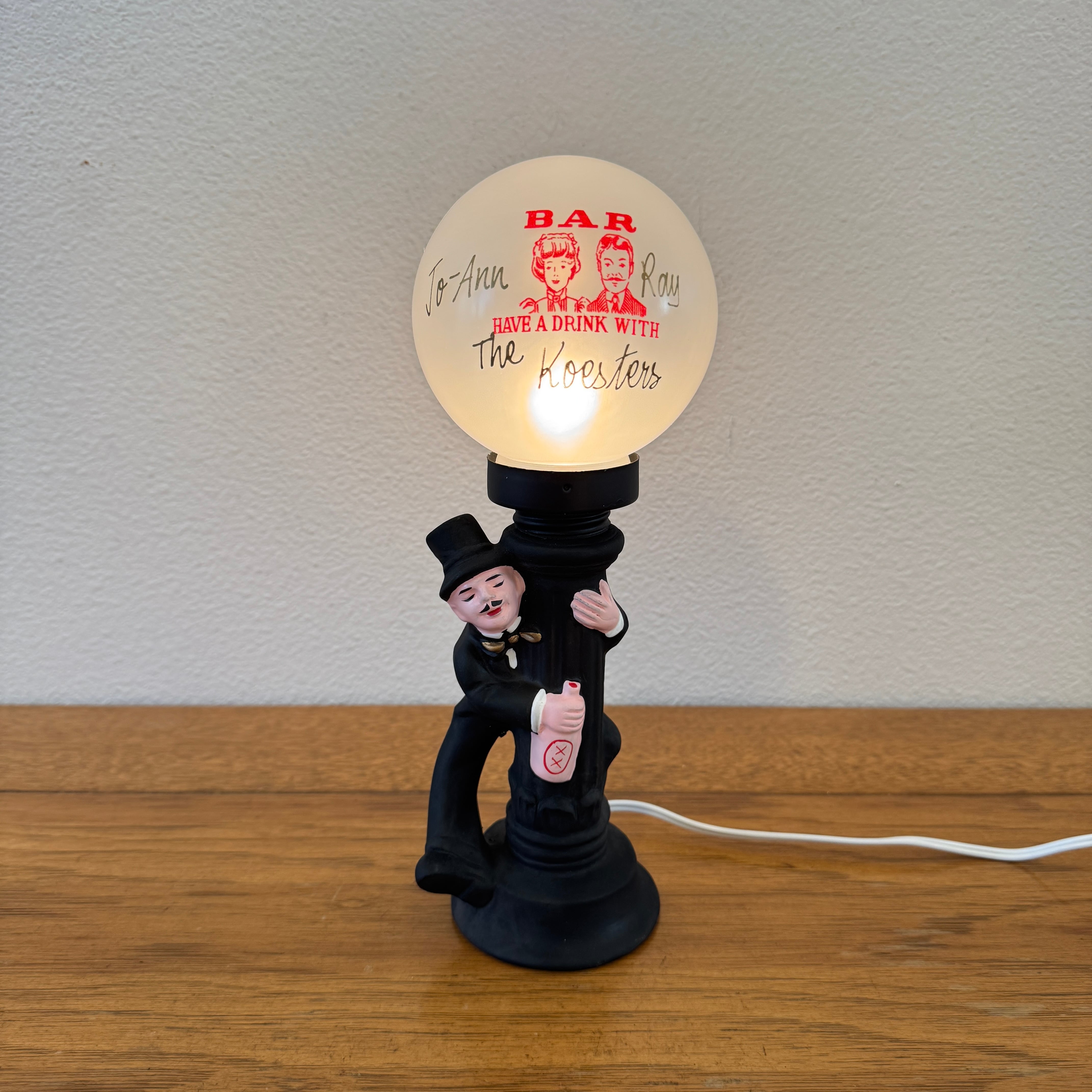 プラ製のシェード部分には「BAR HAVE A DRINK WITH」の文字と、人物イラストが赤いインクで描かれ、個性的な存在感を放っています。支柱にはシルクハットをかぶった紳士が、酔った様子でポールに抱きつきながら酒瓶を握っている立体的なデザイン。