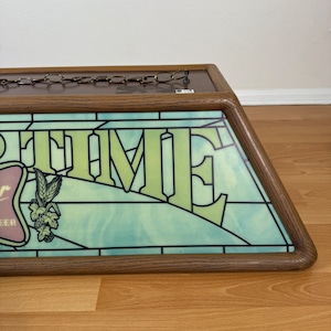 ライト部分はステンドグラス風のプラスチックパネルで構成され、表面には大きく“MILLER TIME”とブランドロゴ、両サイドには象徴的な「月に座る女性」のイラストがデザインされています。
