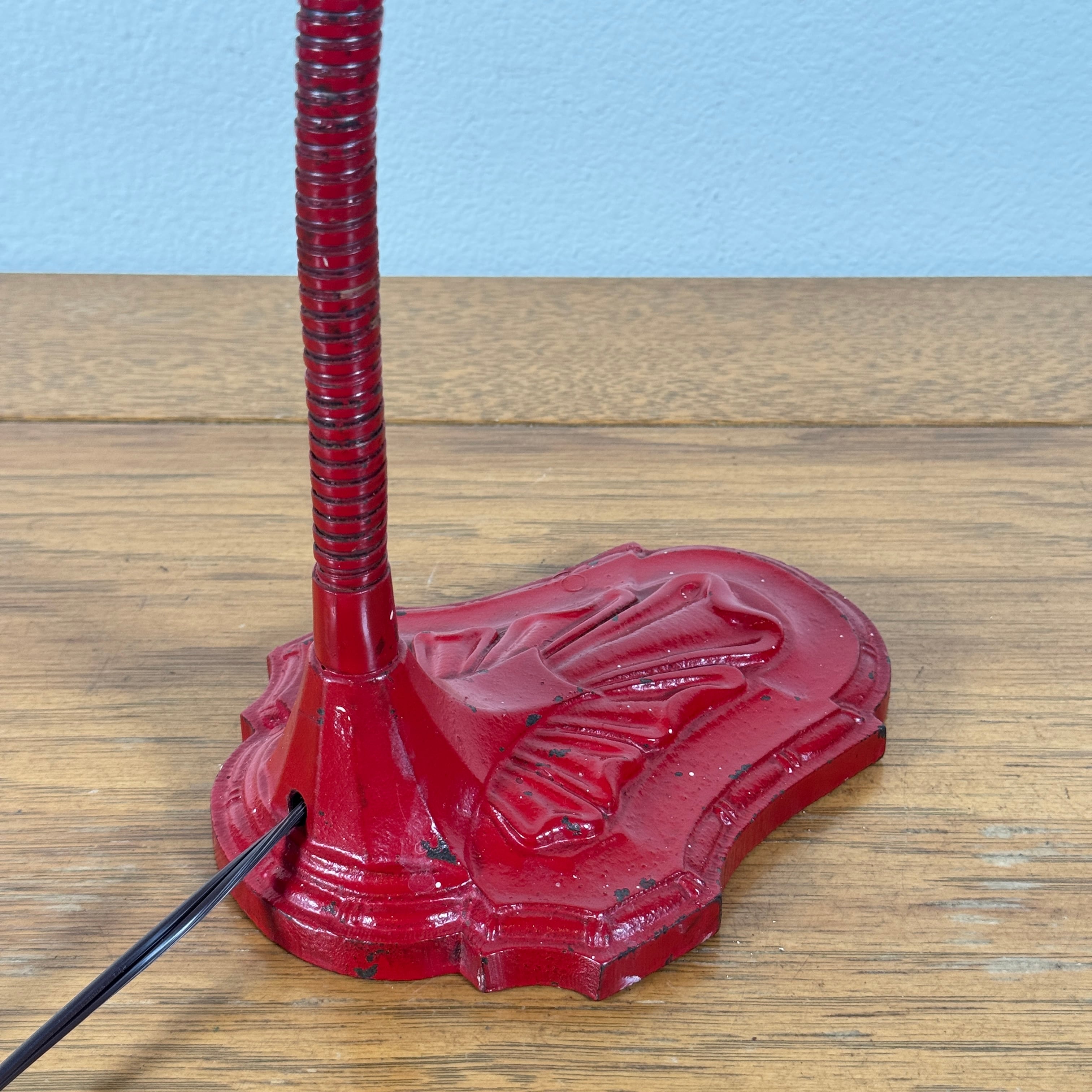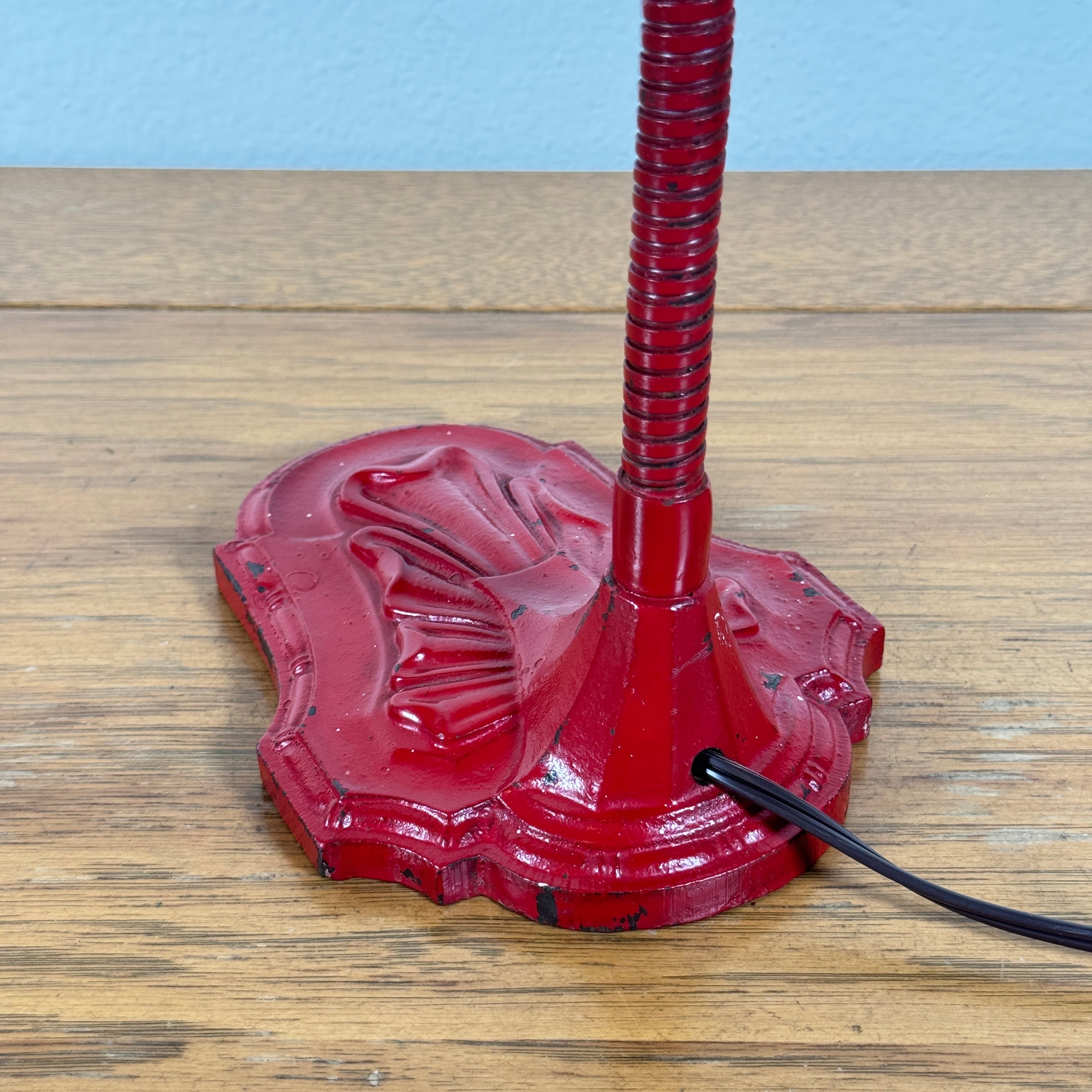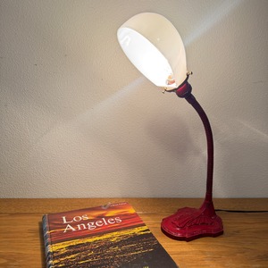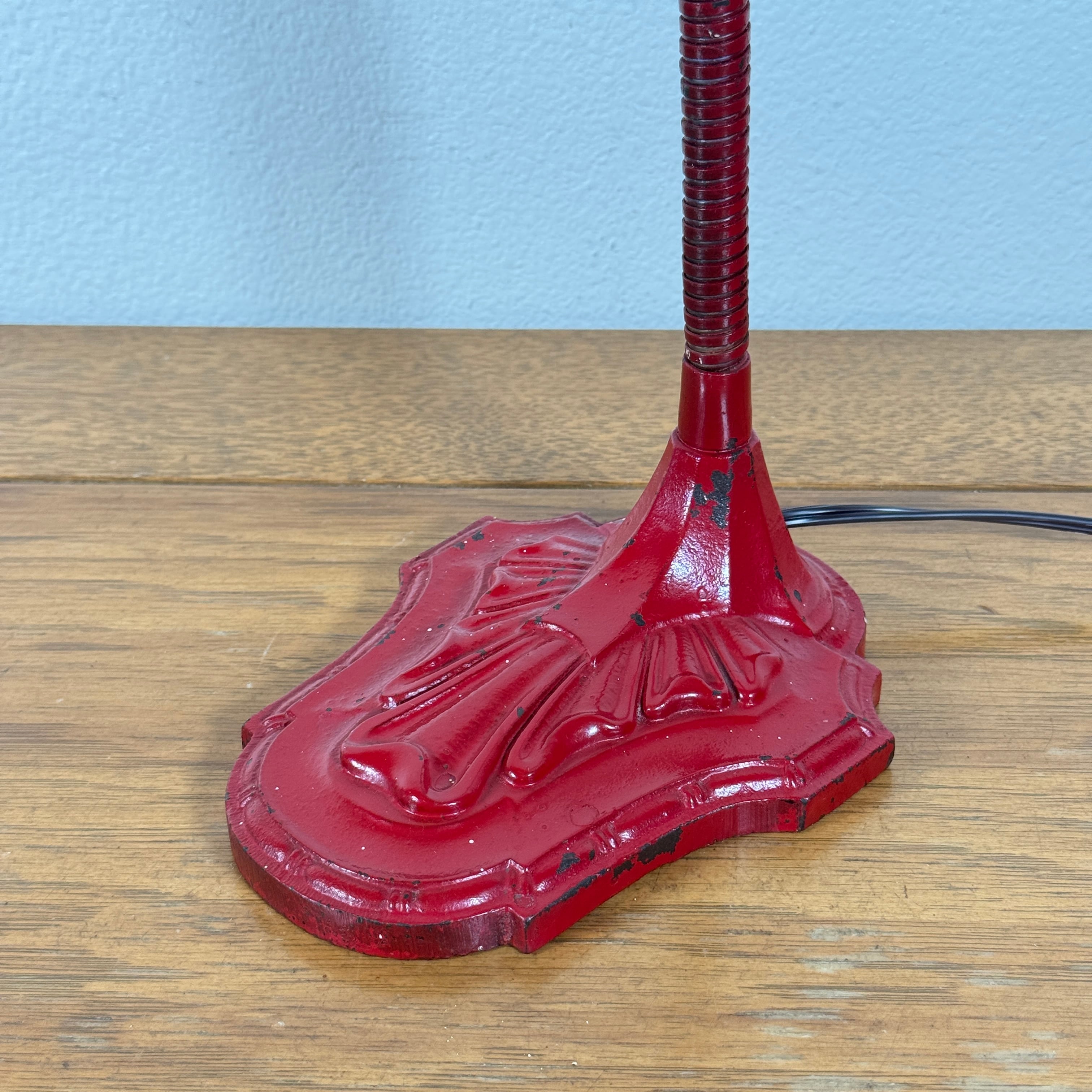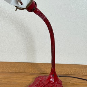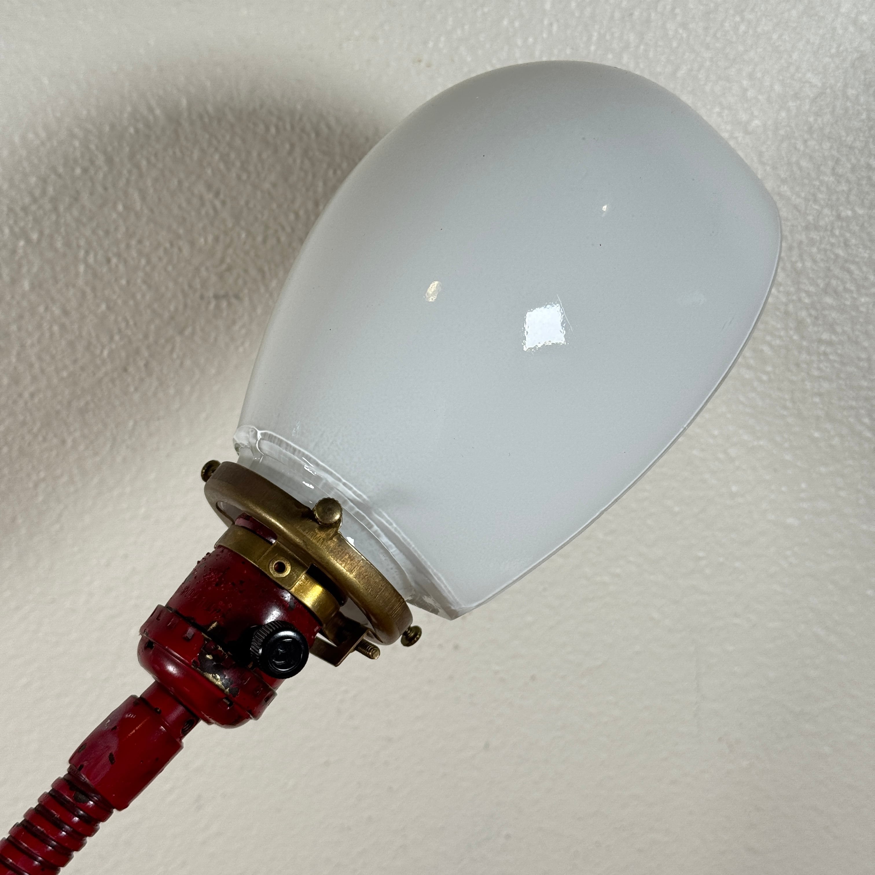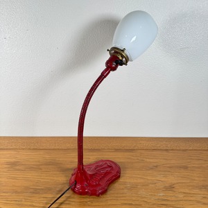 存在感のある赤いベースとアームに、希少なミルクガラス製シェードを組み合わせた一品です。