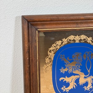 ブルーの盾に金色のライオンが描かれたクラシカルなロゴが、鏡面の背景に美しく映えるデザイン。木製フレームに収められており、落ち着いた雰囲気でありながら存在感抜群です。