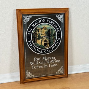 鏡面にレンガ造りのワイナリーの建物が美しく描かれ、周囲にはシルバーの装飾が施されています。下部には同社の有名なキャッチコピー 「Paul Masson. Will Sell No Wine Before Its Time.(時が熟す前にワインは売らない)」 が記され、ブランドの誇りと伝統を感じさせる一枚。
