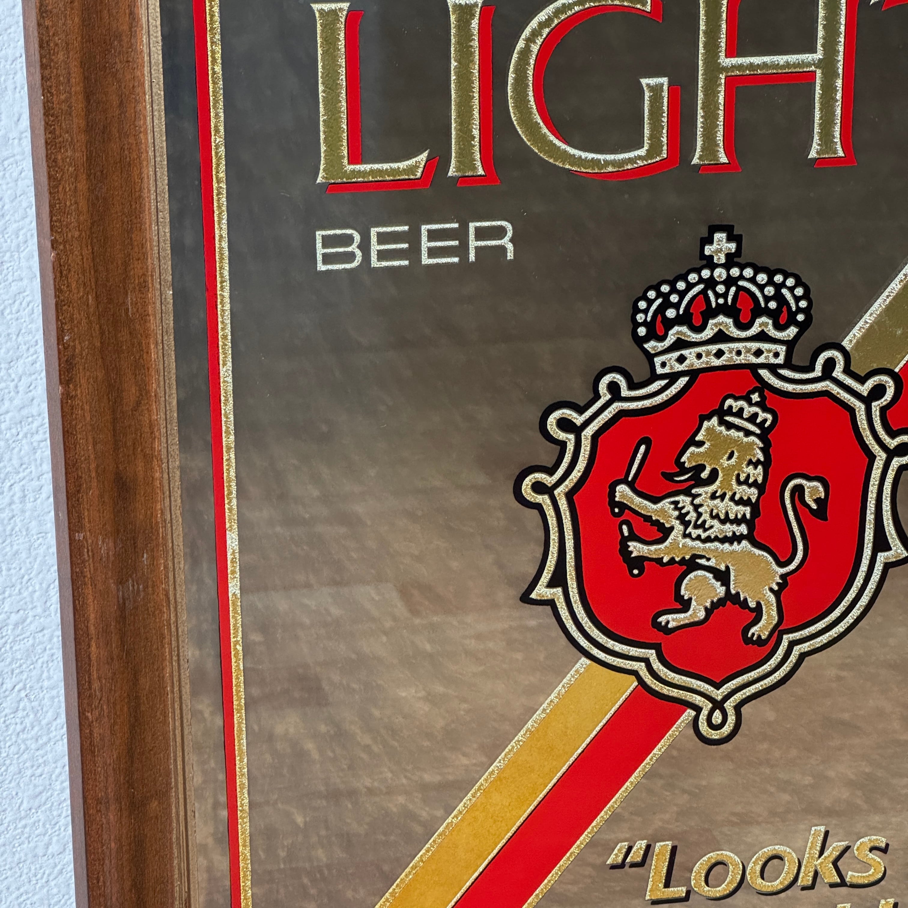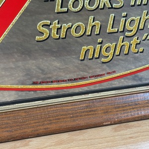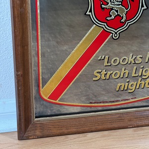 鏡面に赤とゴールドで力強く描かれたロゴと、王冠をかぶったライオンのエンブレムが印象的な一枚です。下部にはキャッチコピー “Looks like a Stroh Light night.” が刻まれ、当時のアメリカンビール文化をそのまま切り取ったようなデザイン。