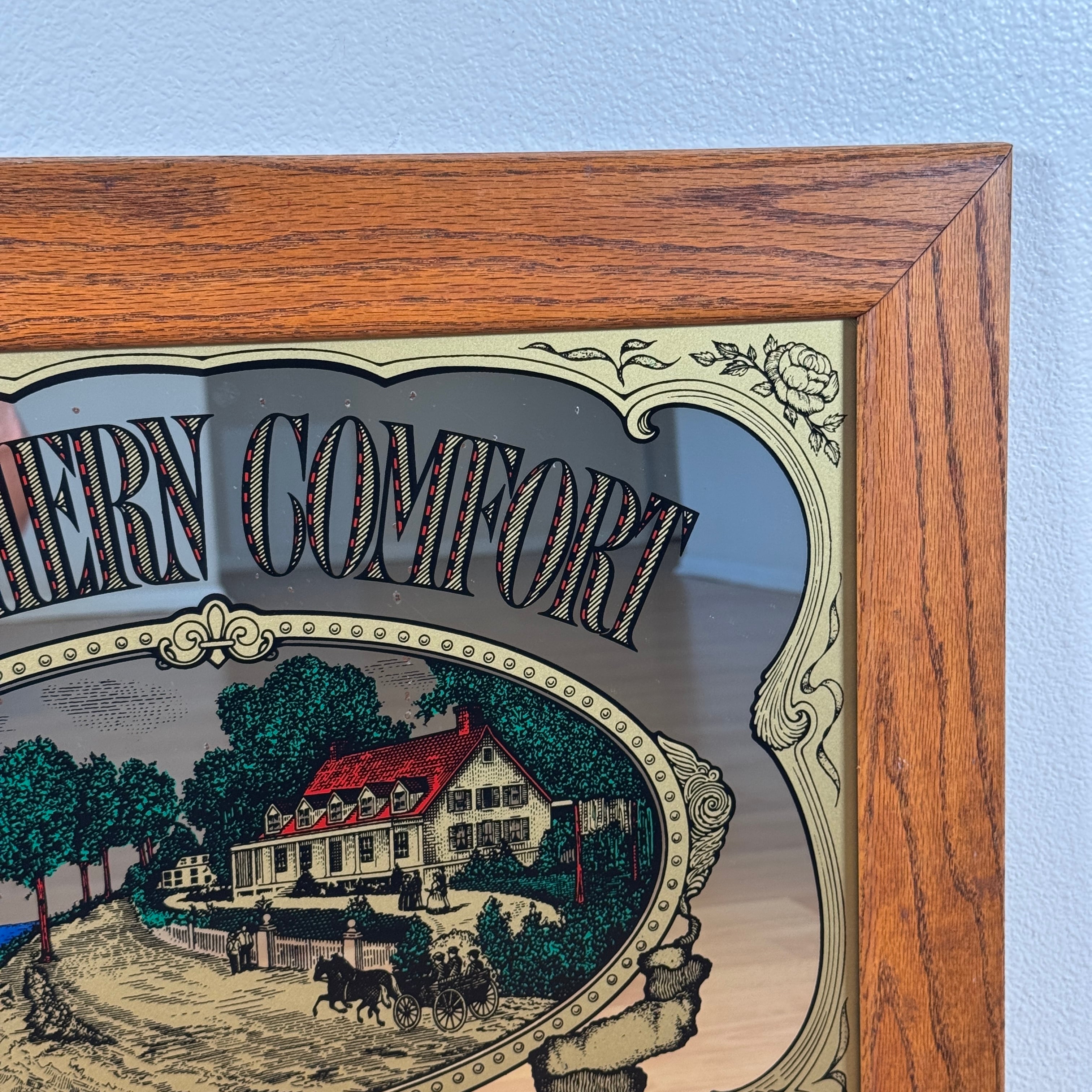 アメリカ南部を代表するリキュール、サザンカンフォートのビンテージパブミラーです。木製のフレームに収められたミラーには、「The Grand Old Drink of the South」と銘打たれたデザインが施され、ミシシッピ川沿いの風景や蒸気船が描かれています。アンティーク感漂う雰囲気は、アメリカンバーやビンテージスタイルのインテリアにぴったり。