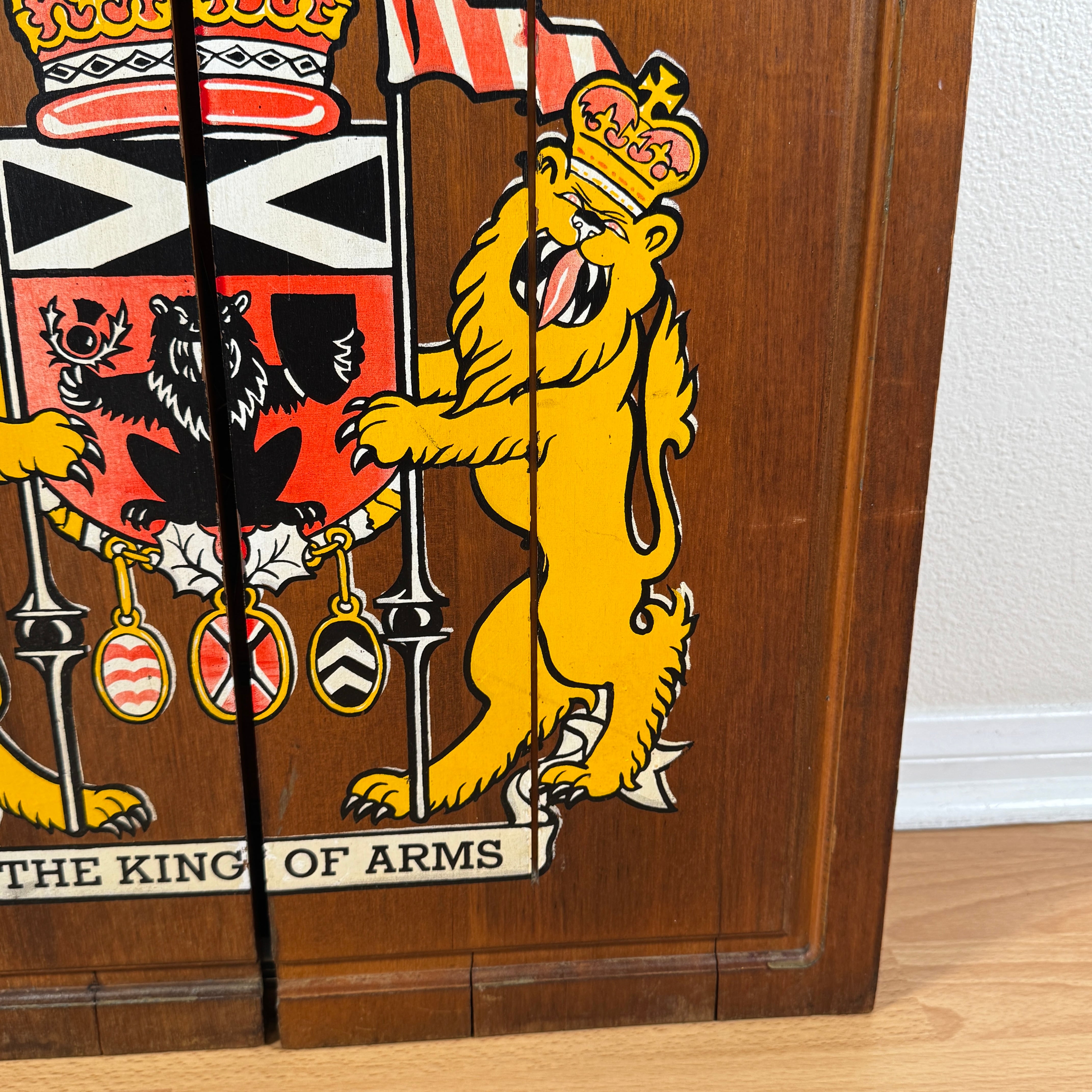クラシックな英国風デザインが魅力の ビンテージ木製ダーツボードキャビネット です。扉の表には「THE KING OF ARMS」とライオンが描かれた紋章があしらわれ、重厚感と存在感たっぷり。扉を開くと中には伝統的なダーツボードとスコアボードが収められており、インテリアとして飾るのはもちろん、実際に遊んで楽しむこともできます。