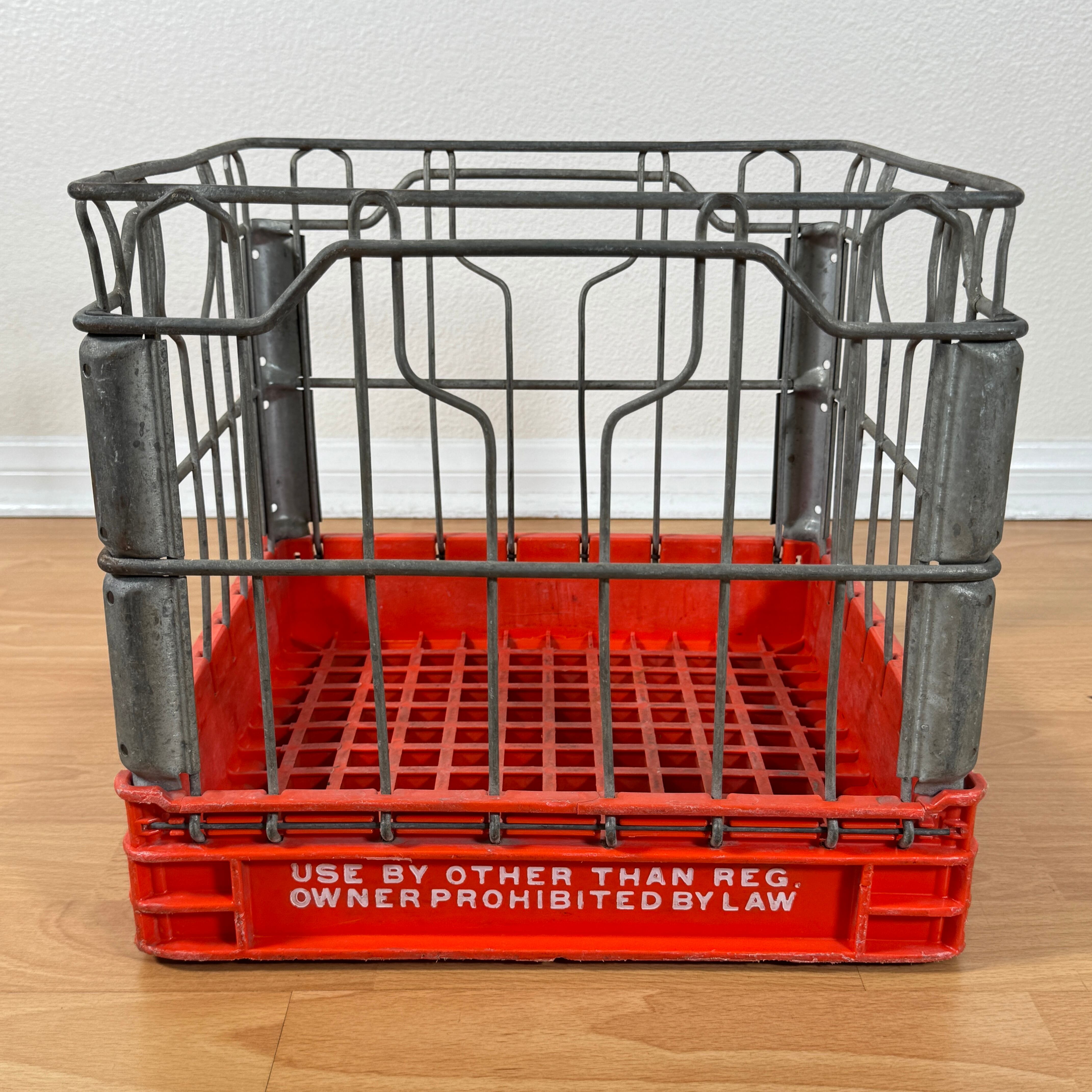 レッドカラーのプラスチックベースに、頑丈なスチールワイヤーが組み合わされた実用性の高いデザイン。ボトルの運搬用として使われていたもので、側面には「USE BY OTHER THAN REG. OWNER PROHIBITED BY LAW(登録所有者以外の使用禁止)」といった表記が残っており、当時の雰囲気を色濃く伝えています。