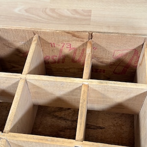 1973年に製造された「7UP(セブンアップ)」の木製ボトルクレートです。ロサンゼルスのボトリング会社で使用されていたもので、仕切り付きで最大24本のボトルを収納できる実用的なデザインになっています。