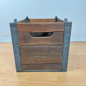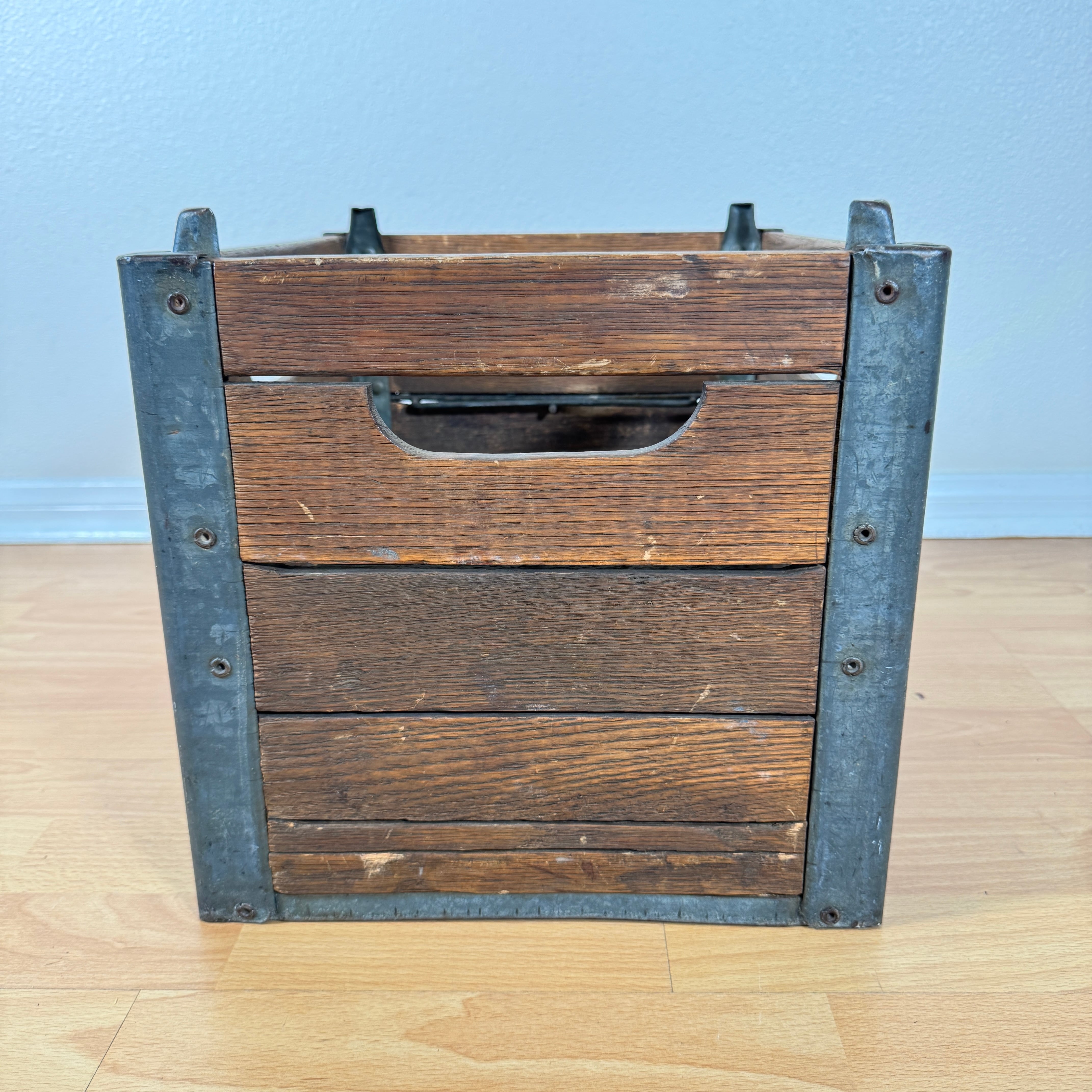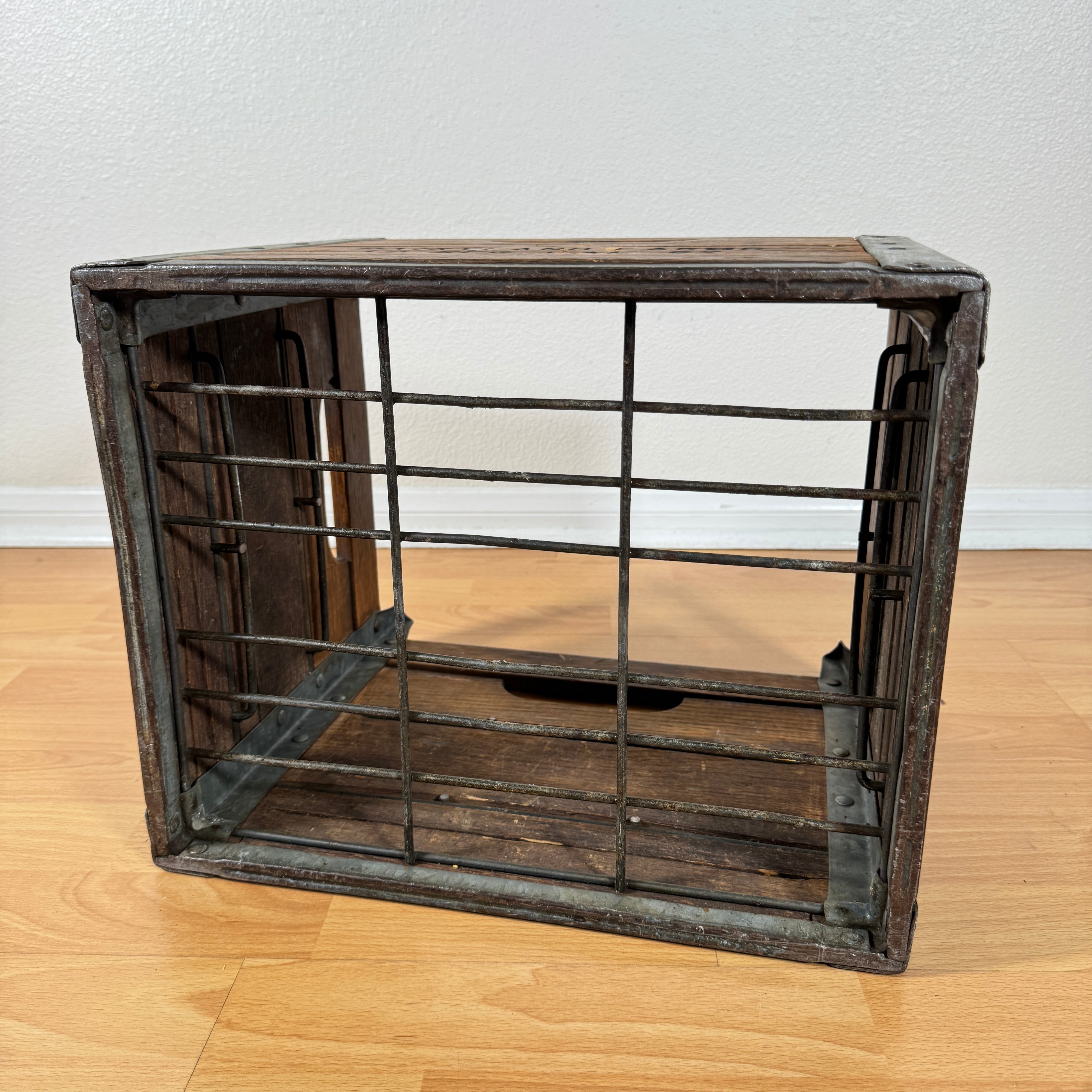 木製のボディと金属の補強フレームで作られており、頑丈さとビンテージならではの雰囲気を兼ね備えています。サイドには「DAIRYLAND FARMS 12 REG CAL 62」と刻印されており、当時の使用用途や時代背景を感じさせる希少な一点です。