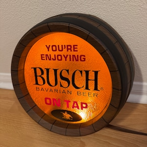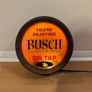 バレル(樽)をモチーフにした丸型デザインに、“YOU'RE ENJOYING BUSCH BAVARIAN BEER ON TAP” のロゴが浮かび上がる、存在感抜群の一品。