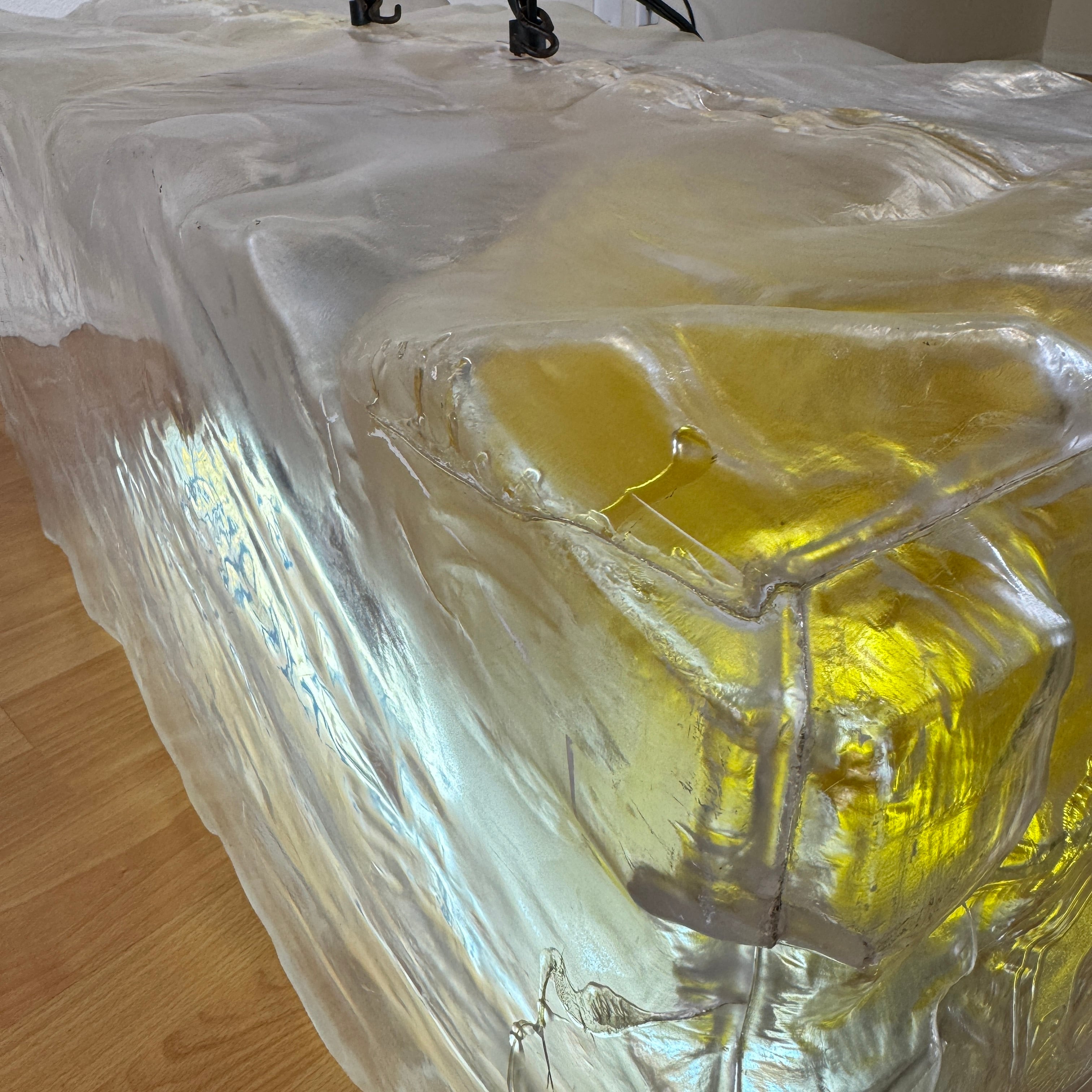 氷の塊(アイスブロック)をモチーフにした透明アクリルの中に、ミラーのボトルが浮かび上がる