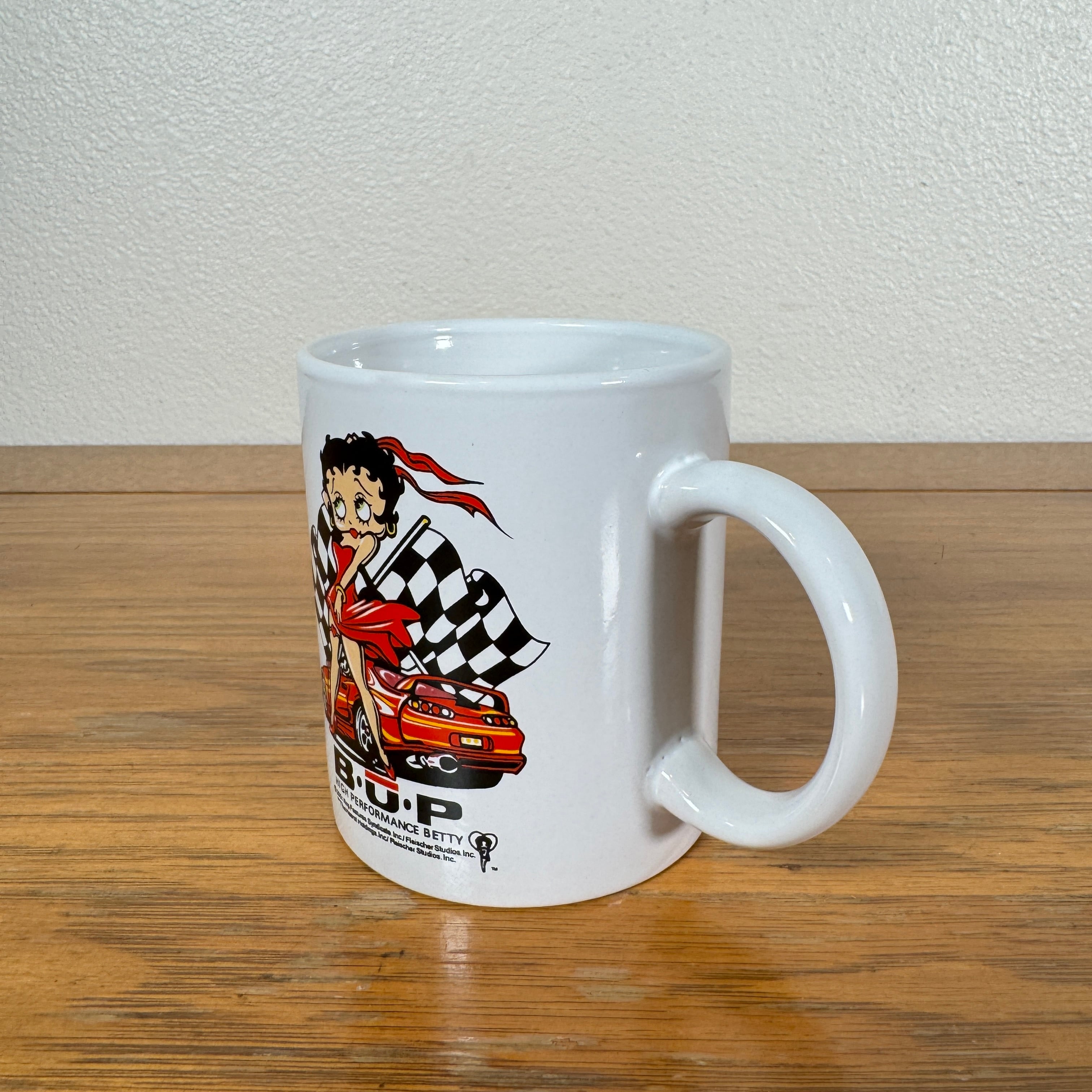 アメリカの人気キャラクター Betty Boop(ベティ・ブープ) が大胆に描かれた、2000年代頃のマグカップです。レーシングカーとチェッカーフラッグを背景にした “HIGH PERFORMANCE BETTY” デザインで、ポップアートのような存在感とアメリカンテイストが魅力の一品。