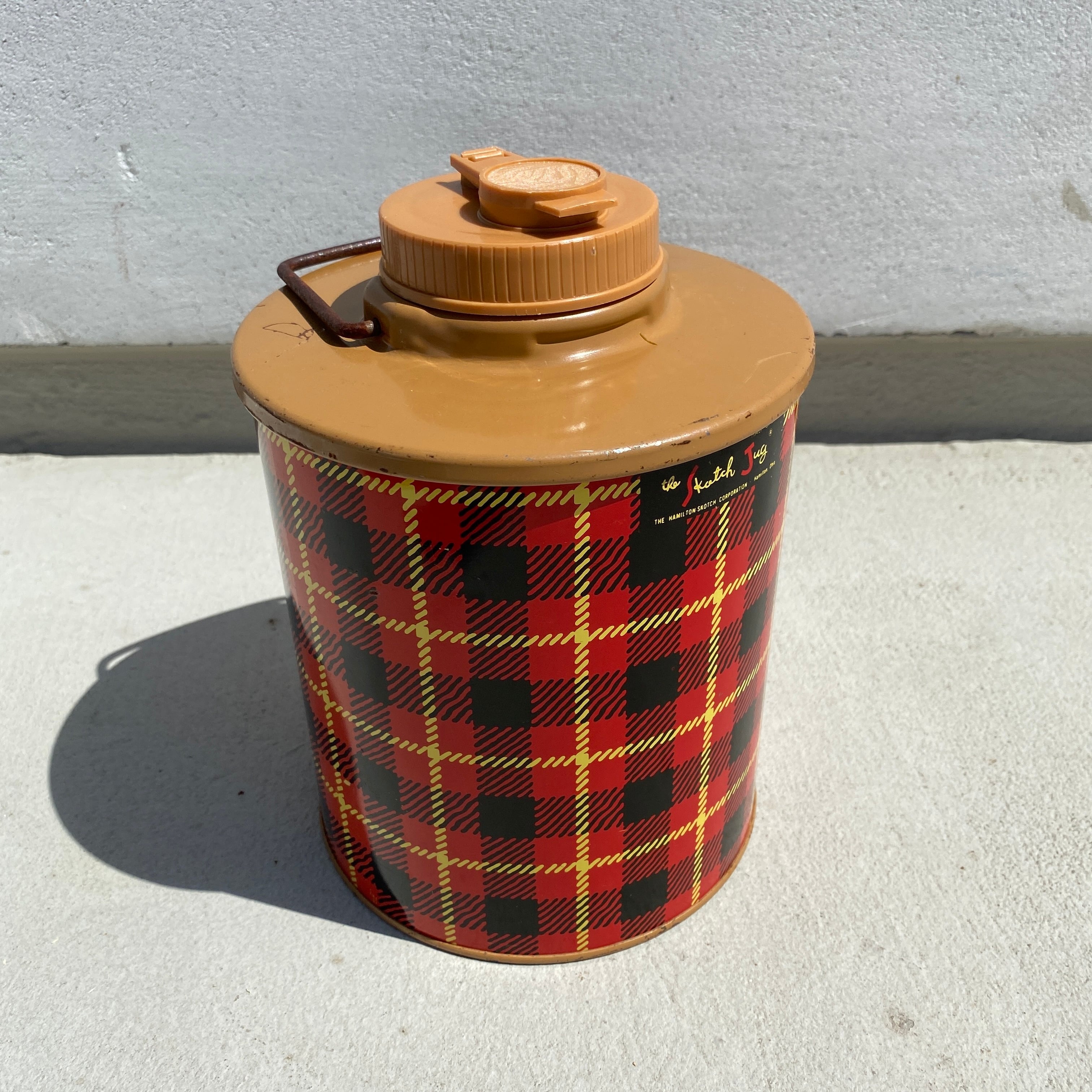 こちらの商品は、オハイオ州ハミルトンを拠点とした1919年設立のHamilton Sheet Metal Companyが1960年代に製造したウォーターボトルです。同社はピクニック用品に進出する前、郵便受けやおろし金を製造していましたが、1950年頃にデザイナーのPetra Cabotを雇いチェック柄の装飾が施されたクーラーのSkotchKoolerブランドを普及させました。アメリカのビンテージキャンパーには今でも愛されている商品です。本品は状態もよく美品です。SkotchKoolerブランドにはクーラーボックスやウォータージャグといった多くの商品が存在します。チェック柄で揃えたギアのサイトは圧巻です。本品をキャンプサイトのアクセントにするのもお勧めです。または、お部屋のインテリアにするのも楽しいですね。