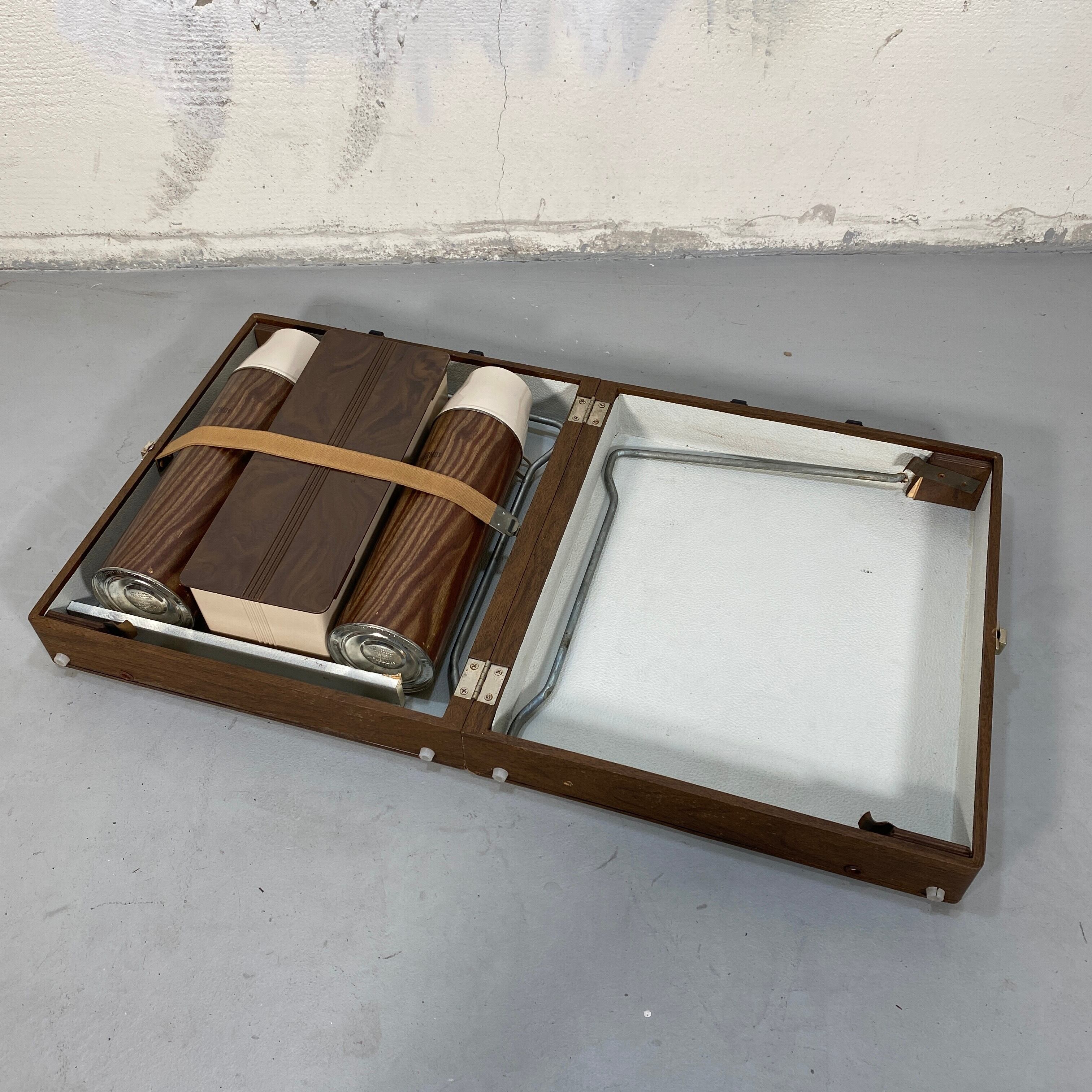 こちらの商品は、1960年-70年代に製造されたサーモスのピクニックセットです。サーモスは、1904年にドイツのベルリンで設立された世界初の真空断熱魔法瓶を製品化したテルモス有限会社に由来します。テルモスはギリシャ語で「熱」を意味するThermeに由来します。1907年にテルモス有限会社から商標を譲受、アメリカでの製造が始まりました。ウッド調のバックの中には水筒が2つ、ランチボックスが1つ収納されています。バックは折り畳みテーブルになっているので、持ち運びも便利でアウトドアシーンで非常に役立ちます!シンプルなデザインで非常にオシャレなのでオススメです!