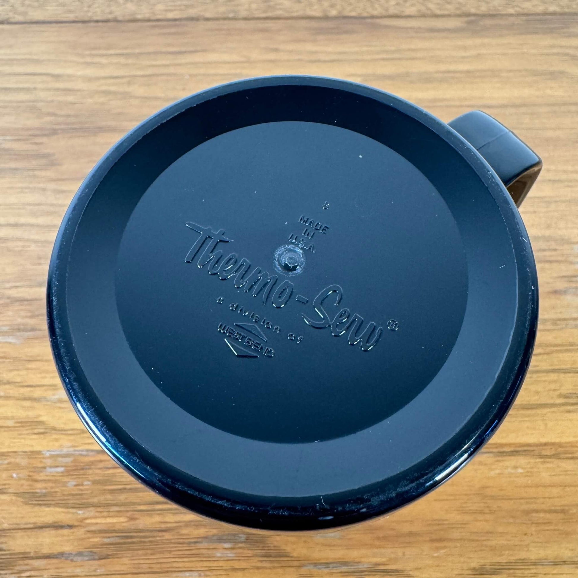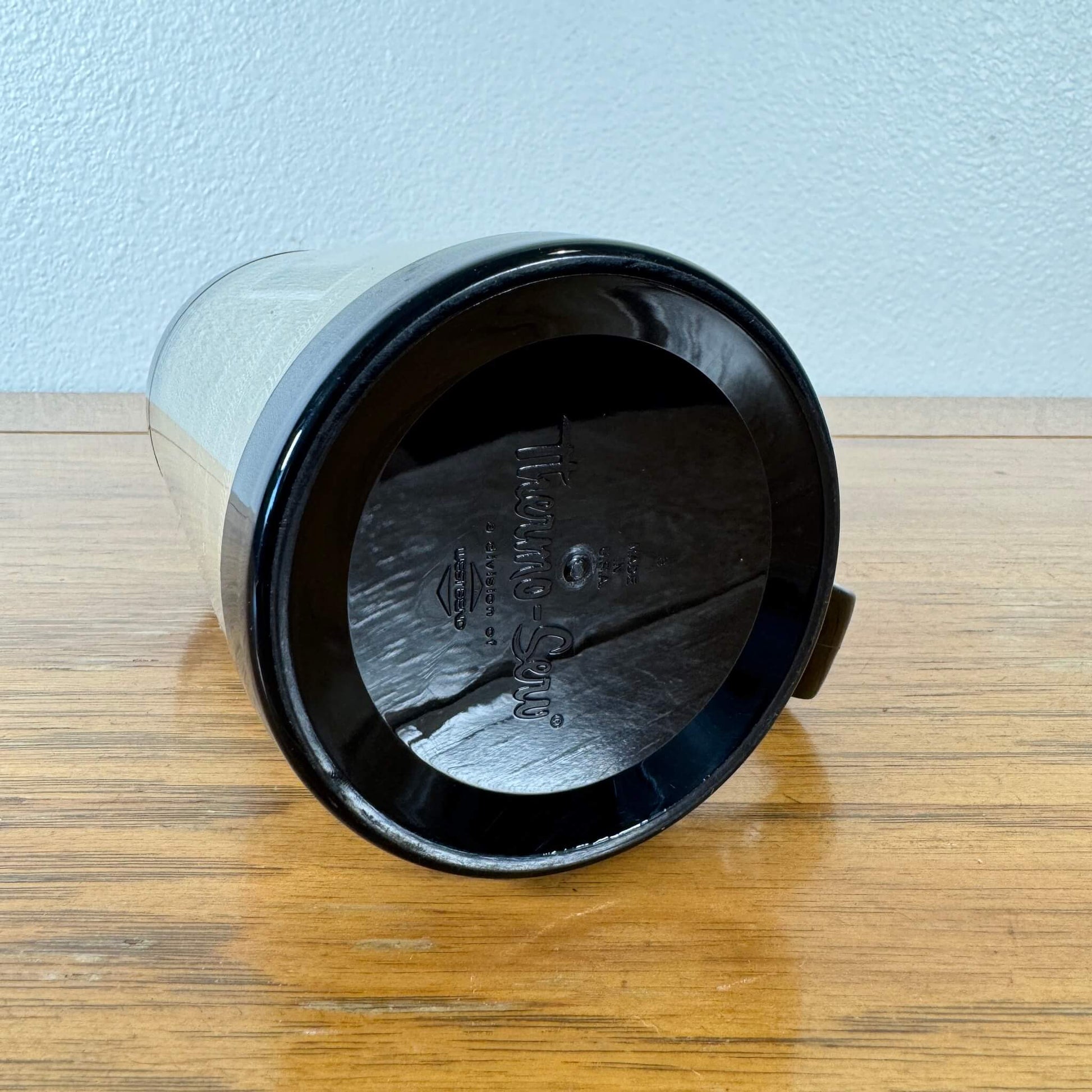 底面には「Thermo-Serv (サーモサーブ)」の刻印があり、これはアメリカの有名な断熱マグブランドです。おそらく二重構造になっており、冷たいビールや飲み物の温度を保ちやすく、テーブルに水滴がつきにくい実用性も兼ね備えています。ハンドルはブラックで、デザイン全体を引き締めています。