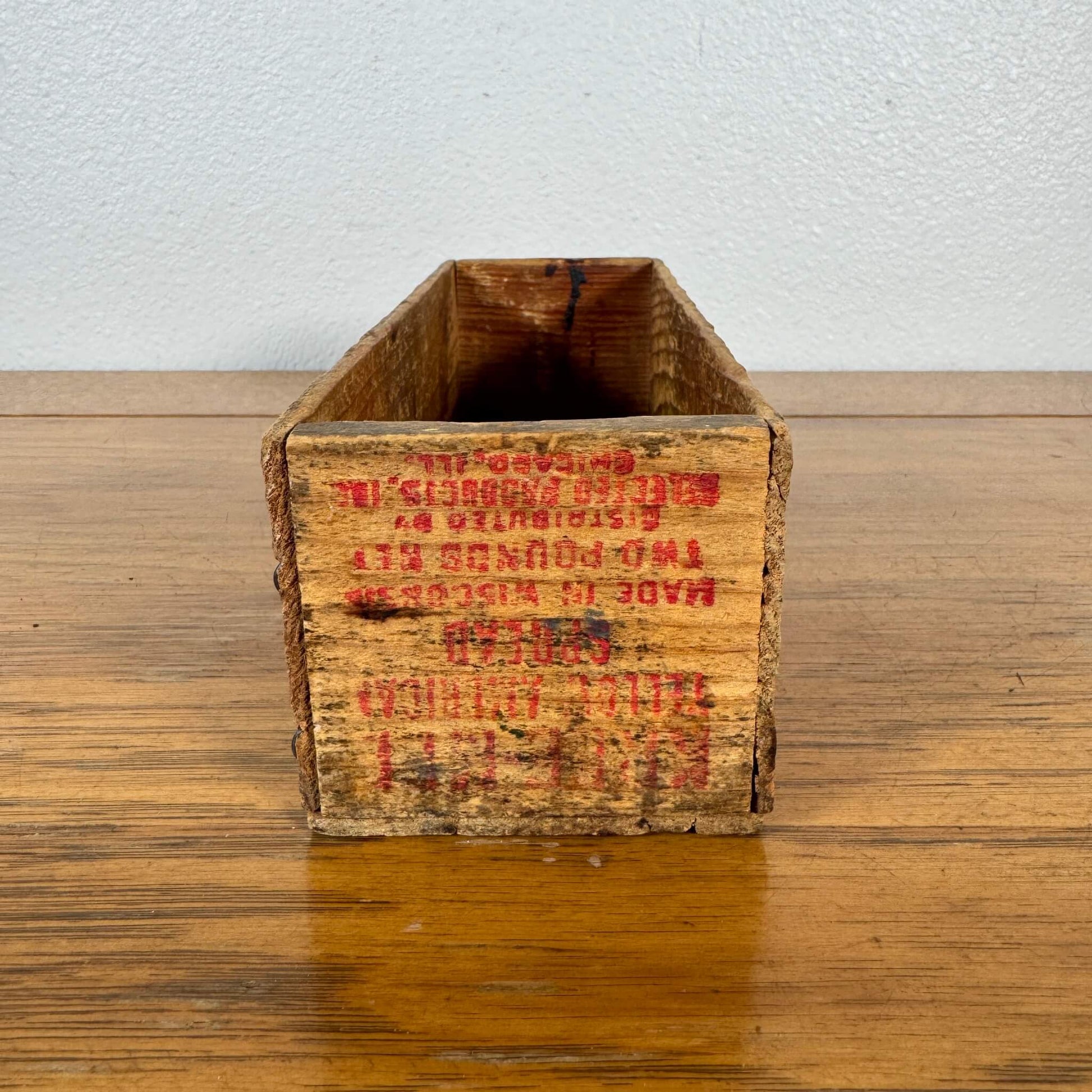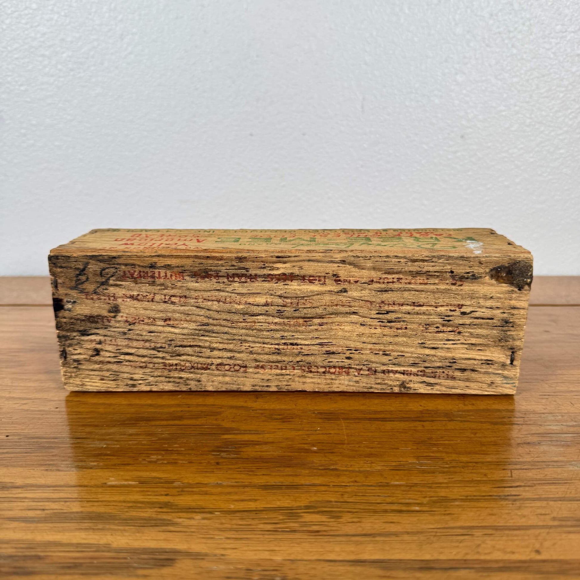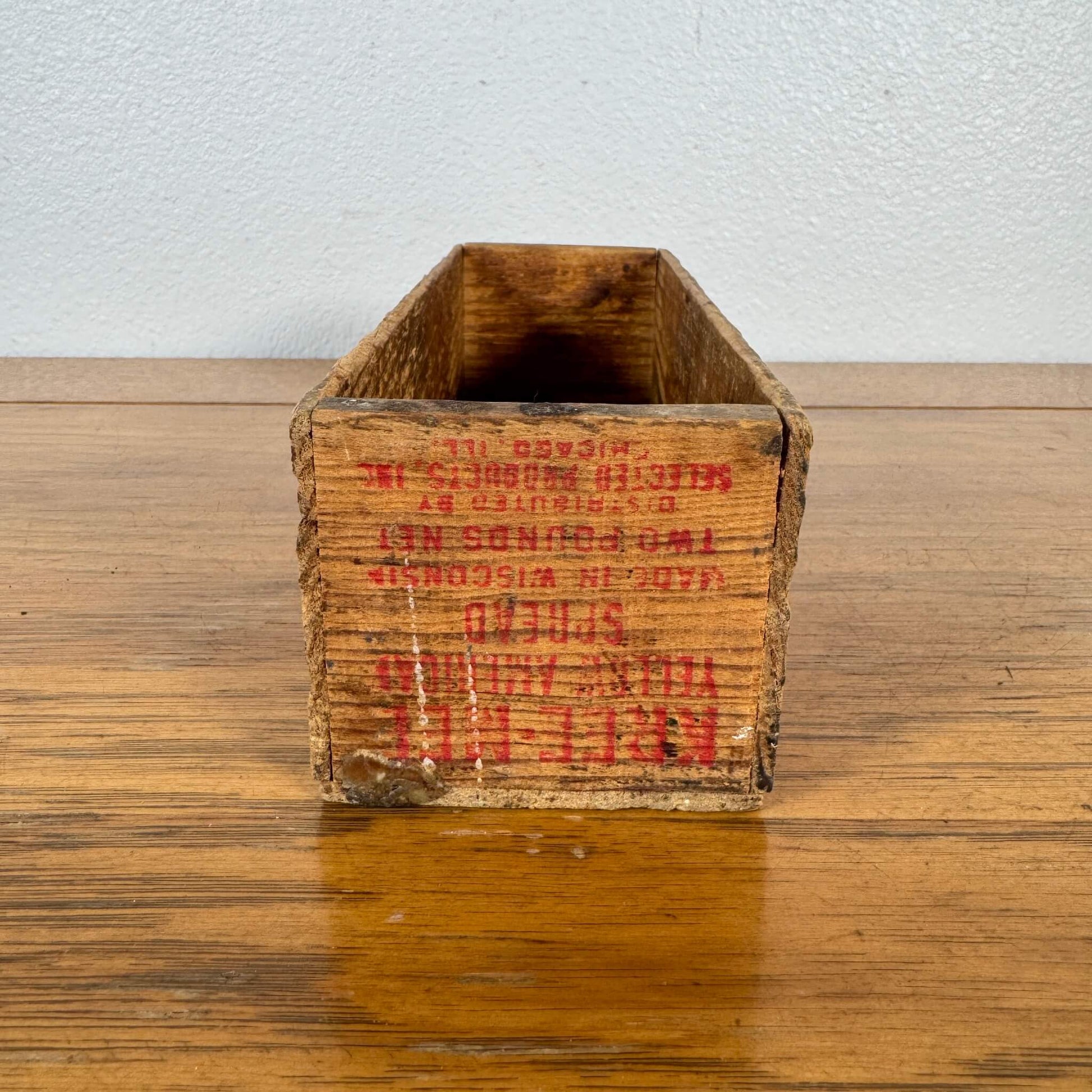 アメリカ・ウィスコンシン州で製造された、KREE-MEブランドの「Yellow American Spread」用ウッドボックス。1940〜50年代に使用されていた実物で、チーズフードの流通用に作られた木箱です。