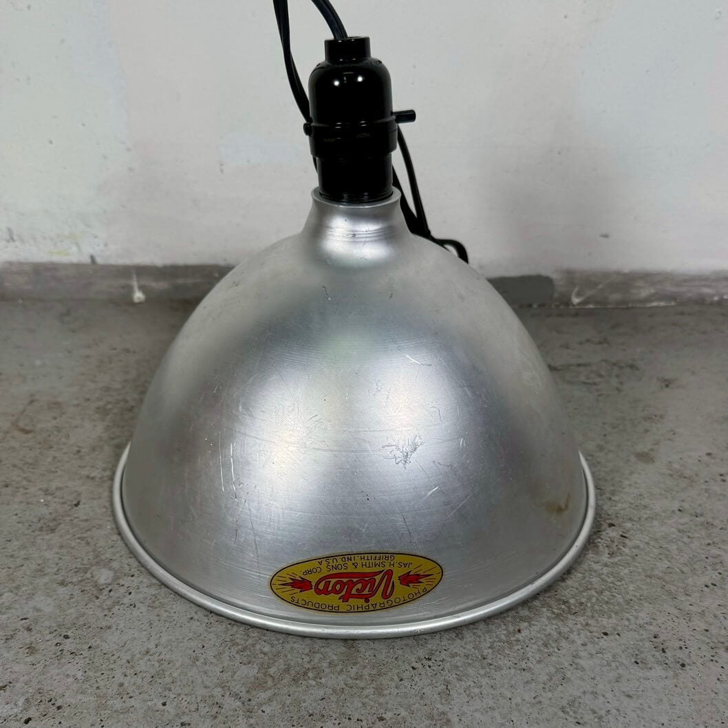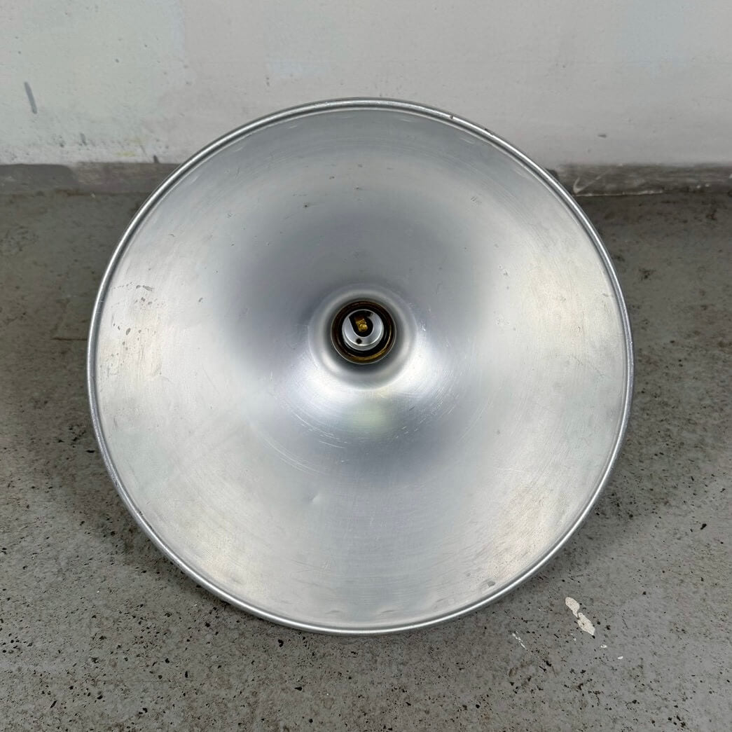 こちらは、Victor社のラベルが残るビンテージのアルミシェードペンダントライトです。もともとは写真館や工場、作業場などで使用されていたインダストリアル系のランプと思われ、無駄のないシンプルなデザインと、アルミならではの軽やかな素材感が魅力です。シェードは丸みのある美しいフォルムで、マットなアルミの質感が空間に自然と馴染みます。ブラックのソケットとの組み合わせも相性が良く、シンプルながら存在感のある雰囲気に仕上がっています。