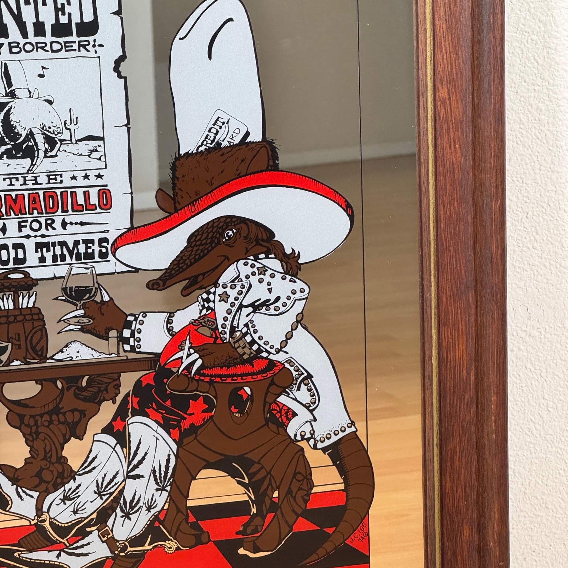 アルマジロがカウボーイ姿で酒場に腰かけるデザインは、当時の広告やバーアートを思わせるユニークな雰囲気。壁に掛ければ、一気にアメリカン・サルーンやカントリーバーの世界観を演出してくれます。