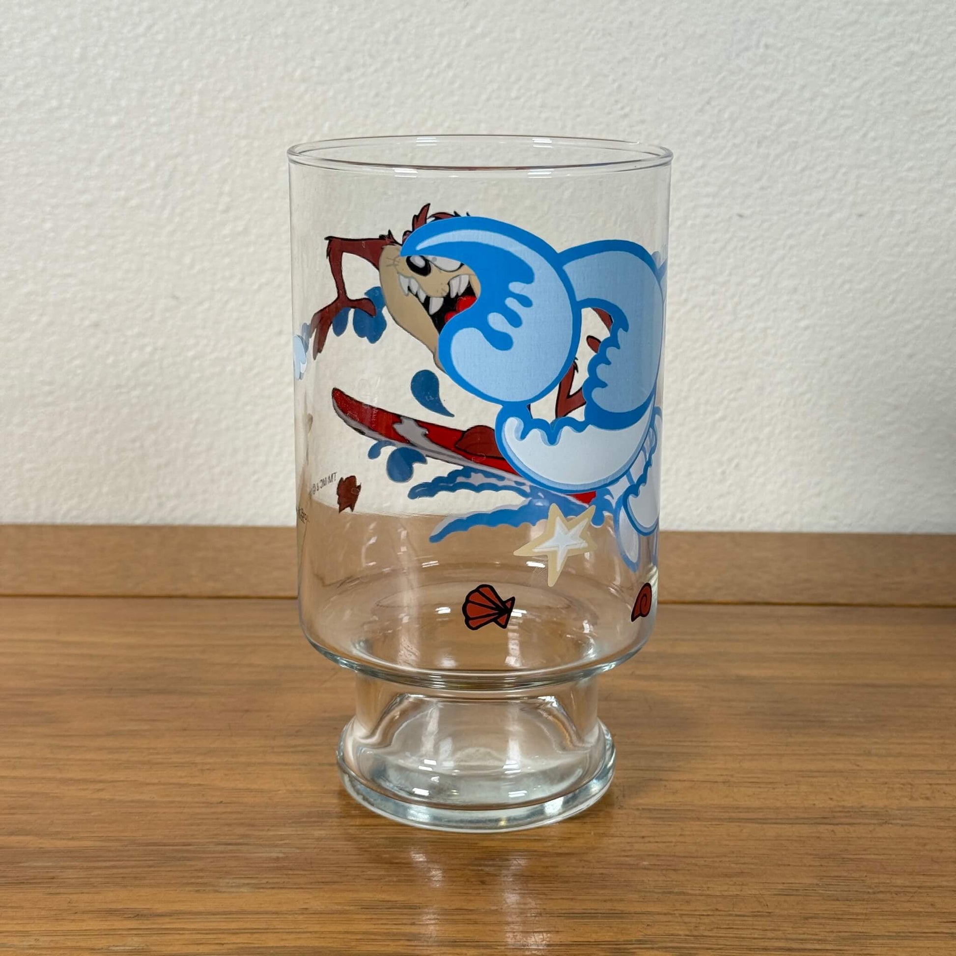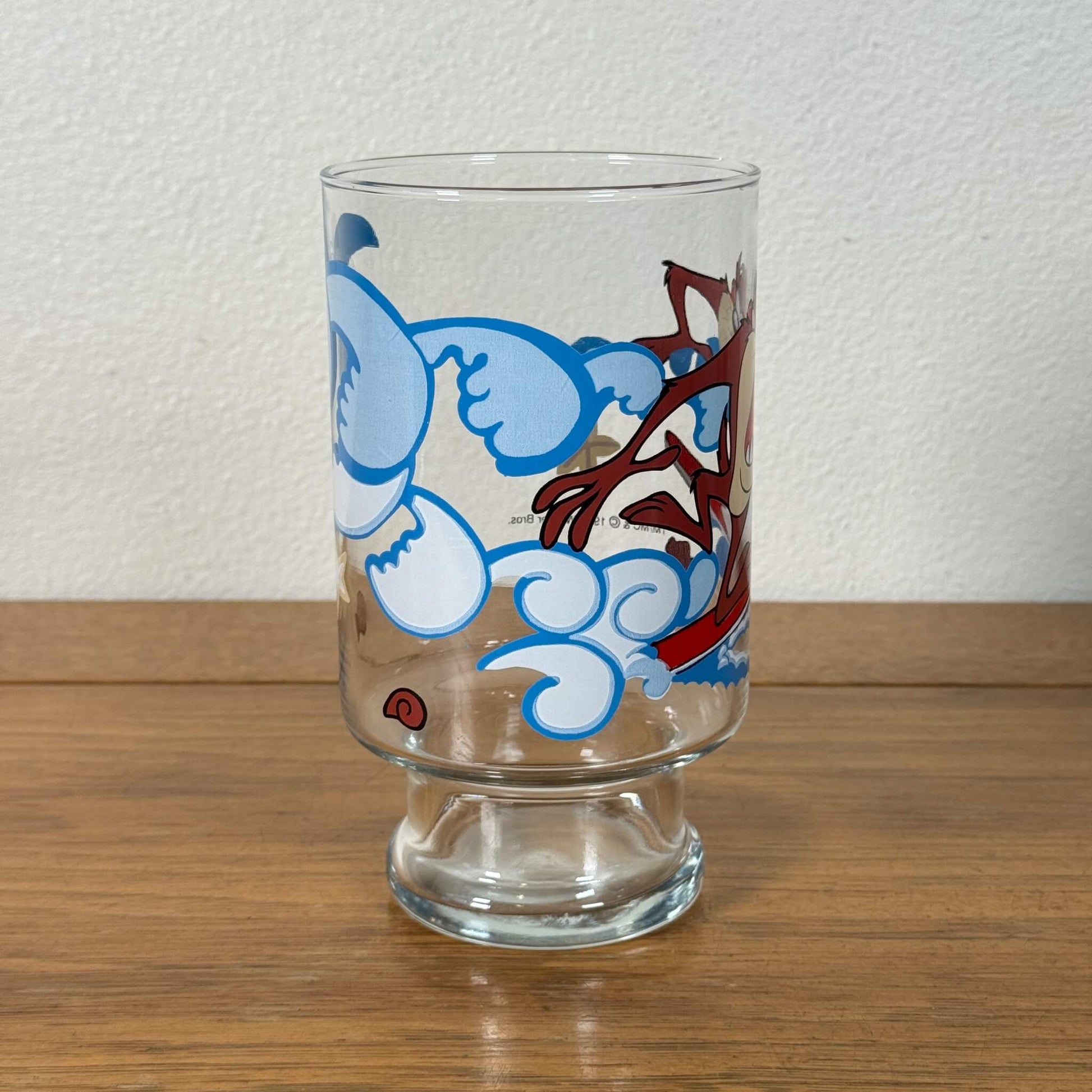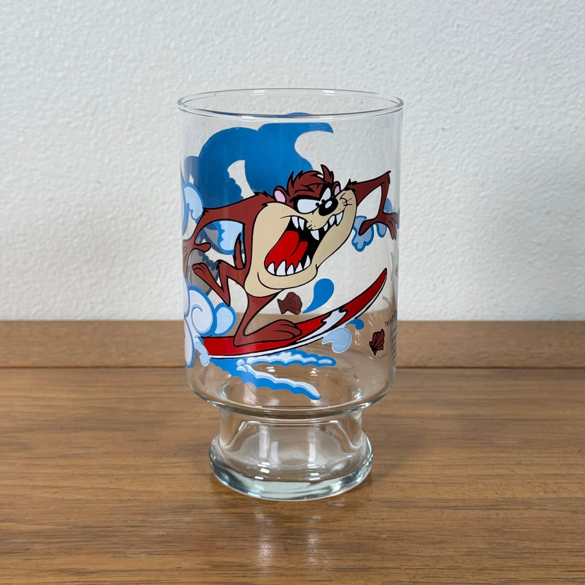 ルーニー・テューンズの人気キャラクター「タズ(Taz)」がサーフボードに乗って波をかき分ける、ユーモアたっぷりのビンテージグラスです。