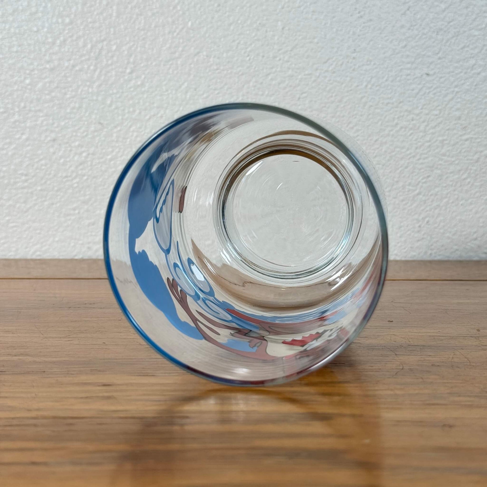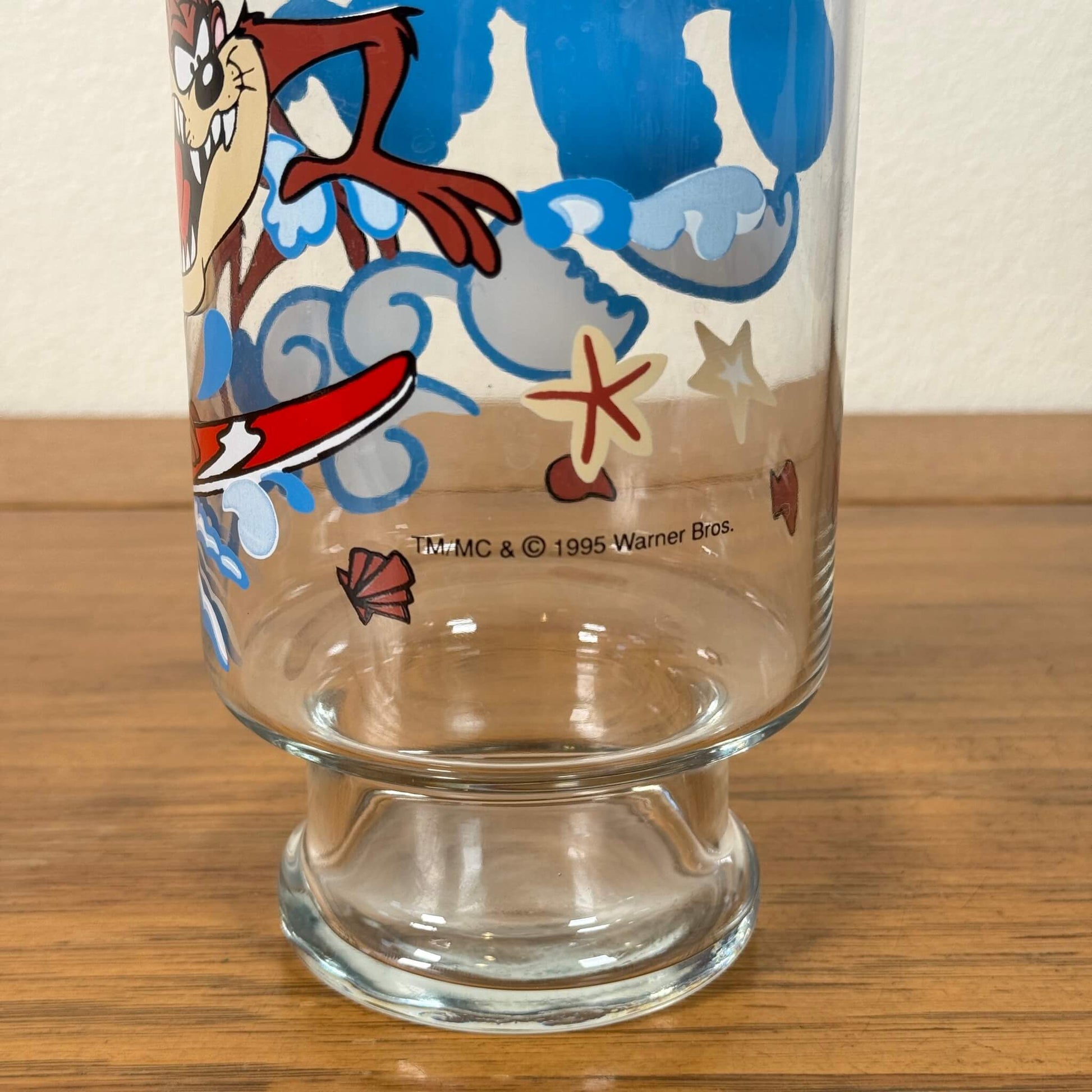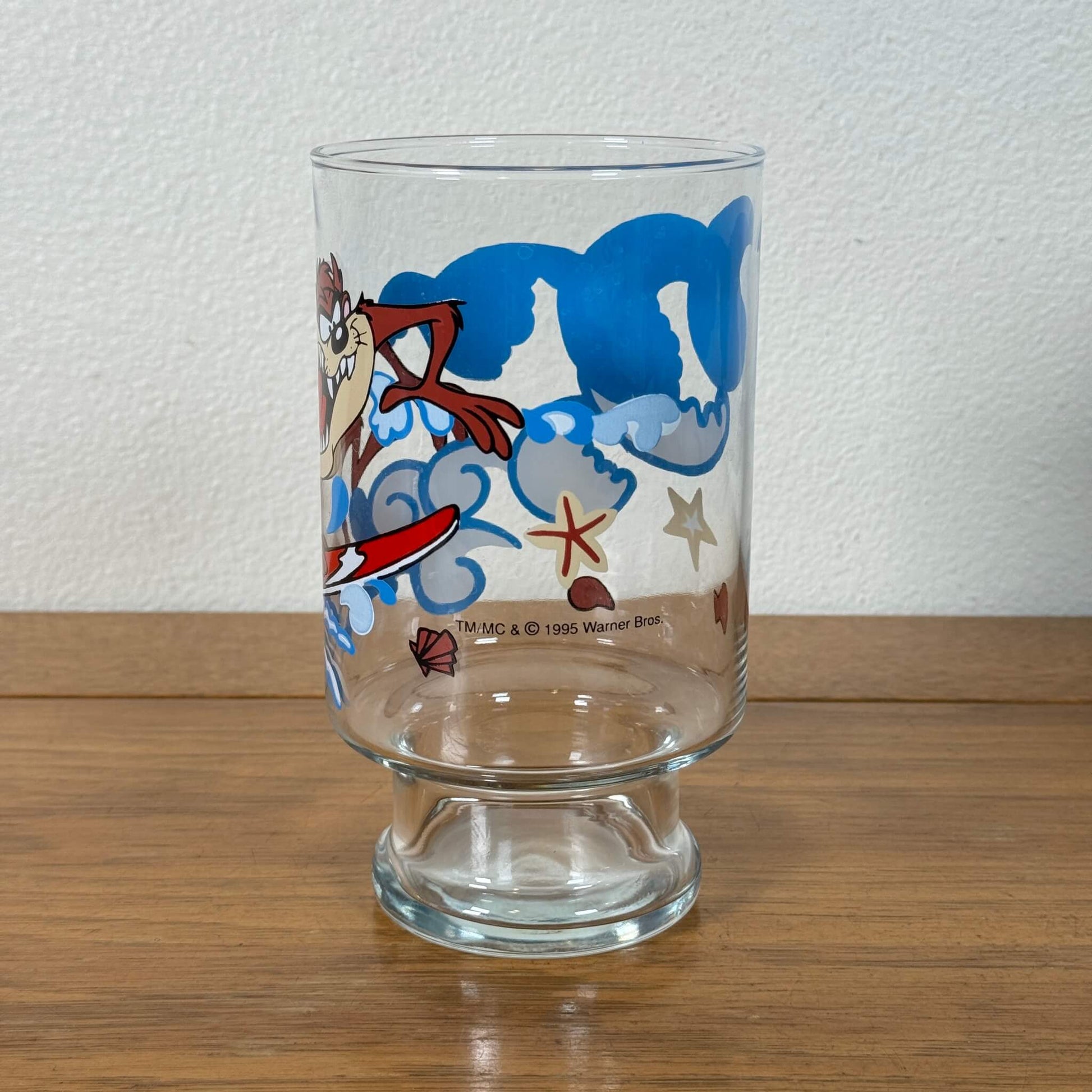 ルーニー・テューンズの人気キャラクター「タズ(Taz)」がサーフボードに乗って波をかき分ける、ユーモアたっぷりのビンテージグラスです。