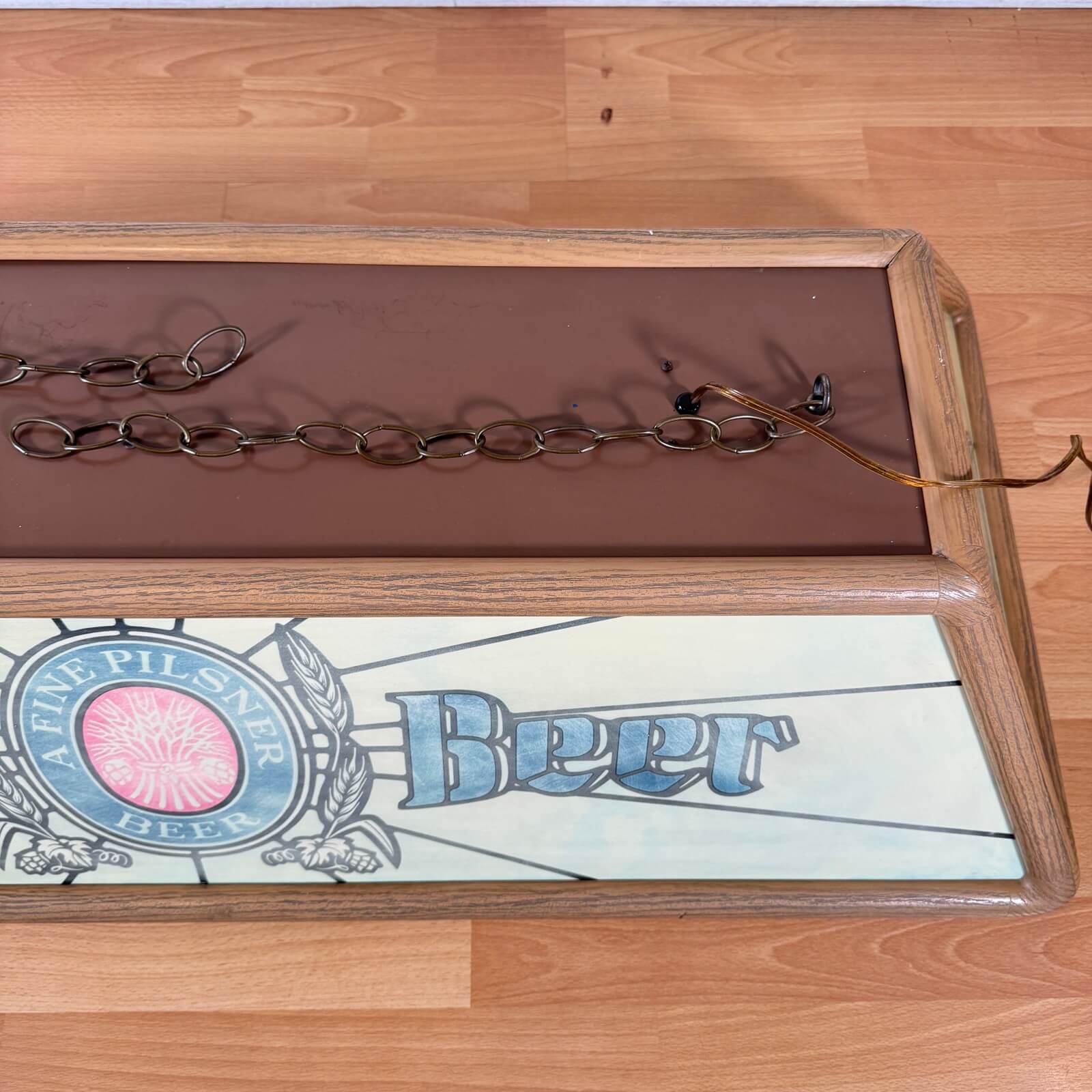 “A Fine Pilsner Beer” のロゴが入ったクラシックなデザインは、点灯すると温かみのある光を放ち、空間全体をレトロなムードに包み込みます。