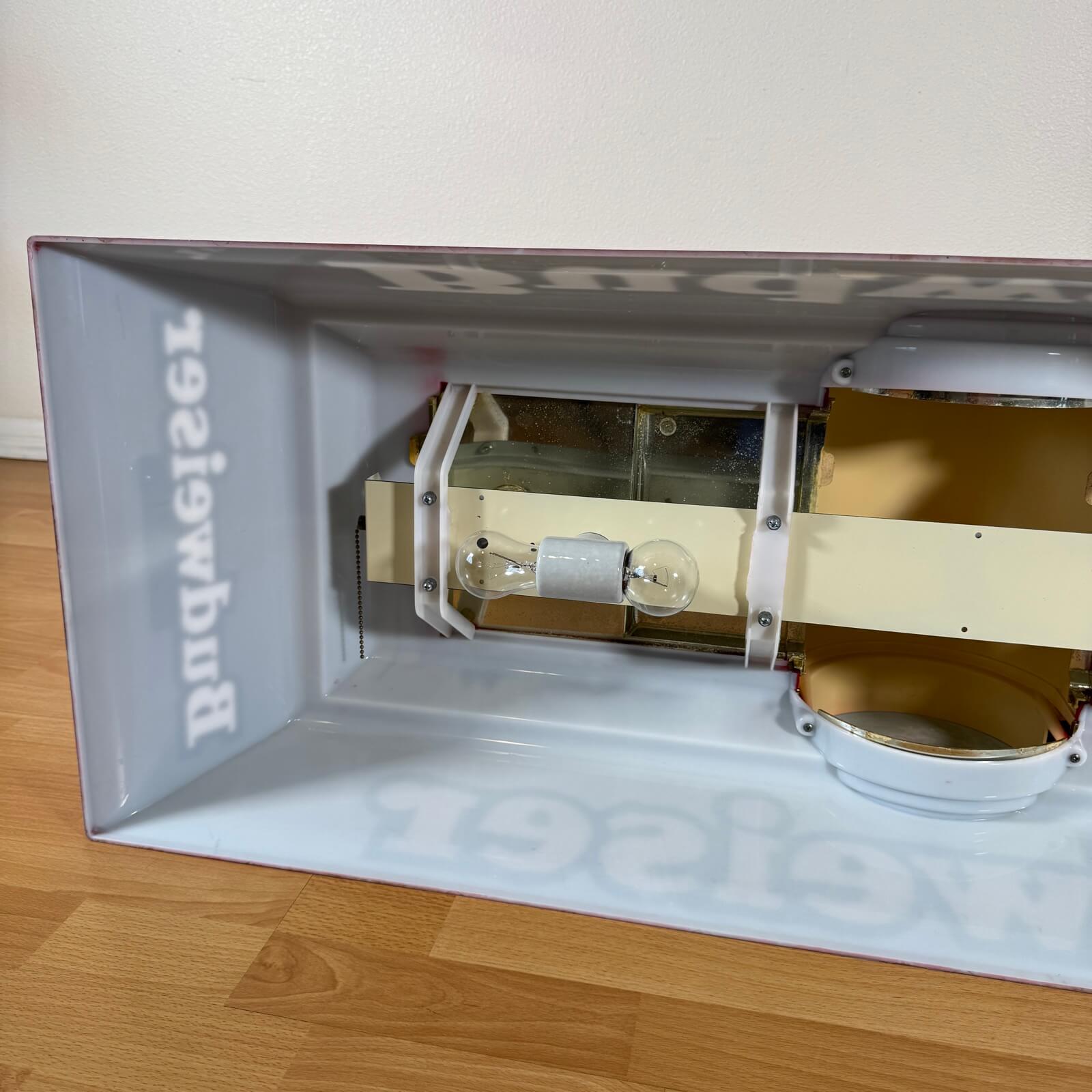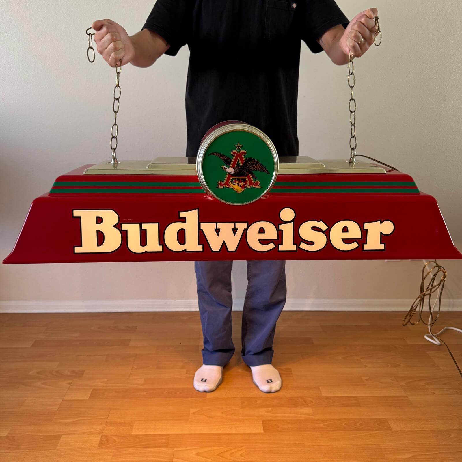 点灯すると「Budweiser」のロゴが柔らかく浮かび上がり、クラシックなバー空間を演出。プールテーブルの上やガレージバー、ショップディスプレイにも映える王道デザインです。