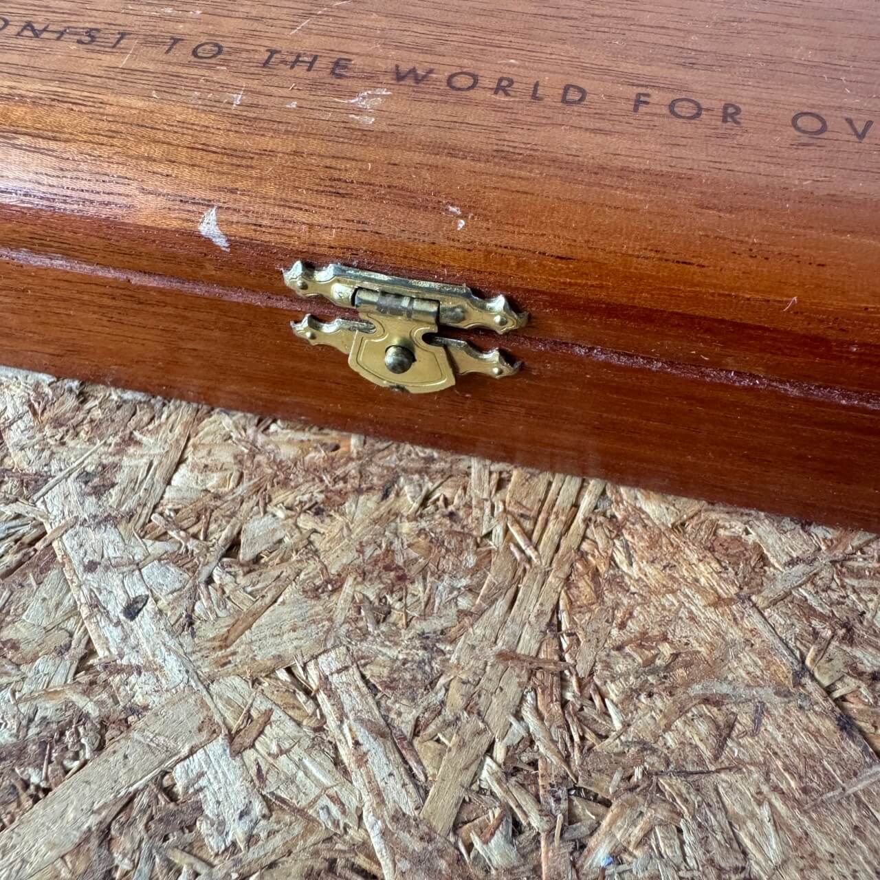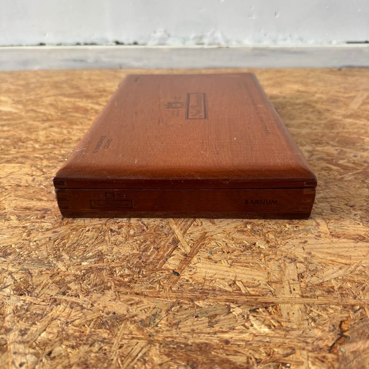 葉巻の保管用として使用されていた木製ケースで、温かみのあるウッドの質感と、シンプルながら上品なロゴデザインが魅力の一品。蓋の内側にはブランドロゴや表記がしっかりと残っており、当時の雰囲気を感じさせてくれます。