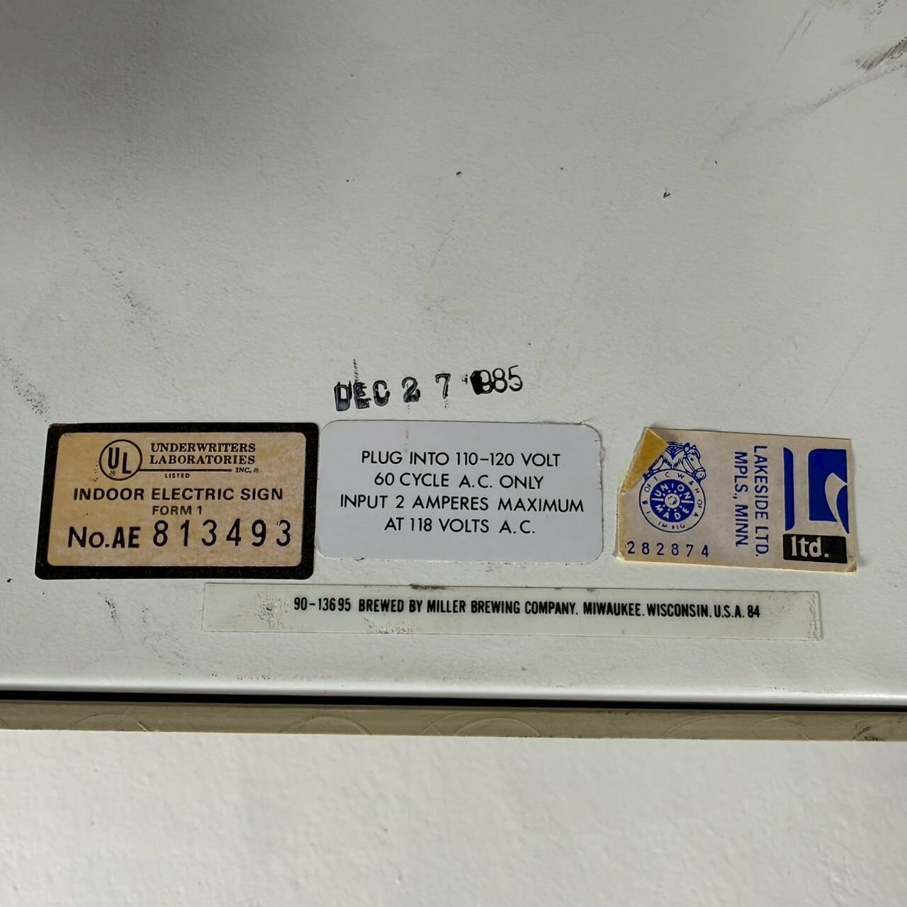 1985年に製造された、Millerのビンテージライトサインです。