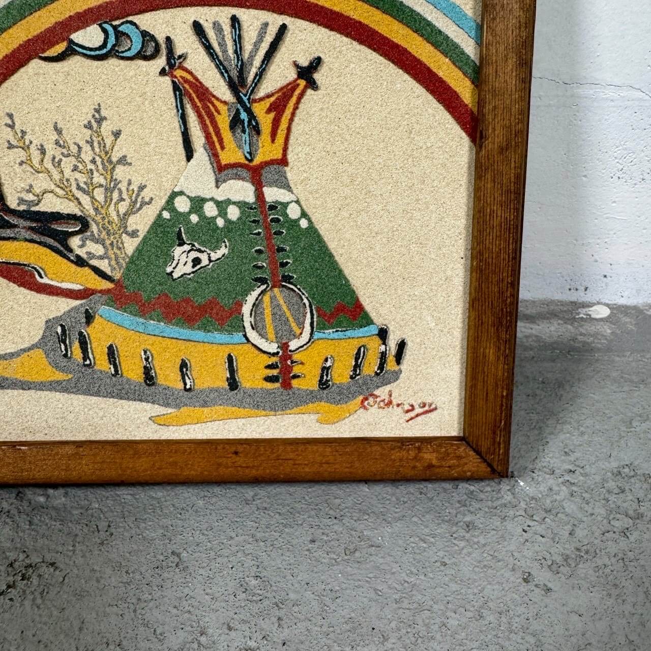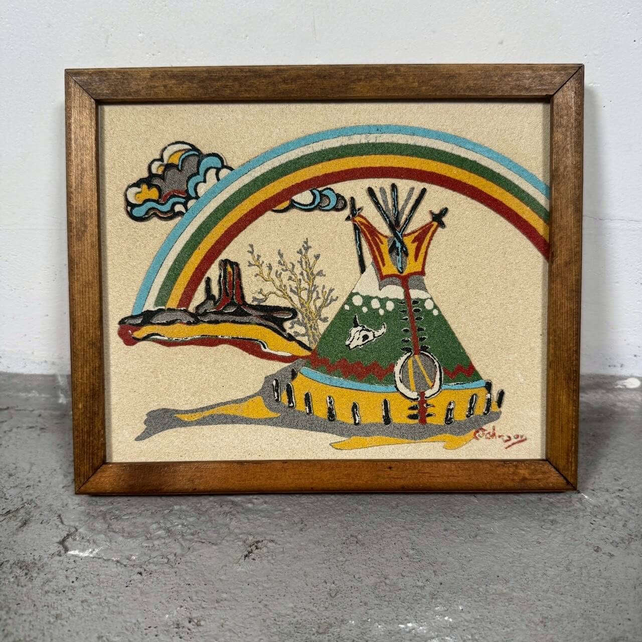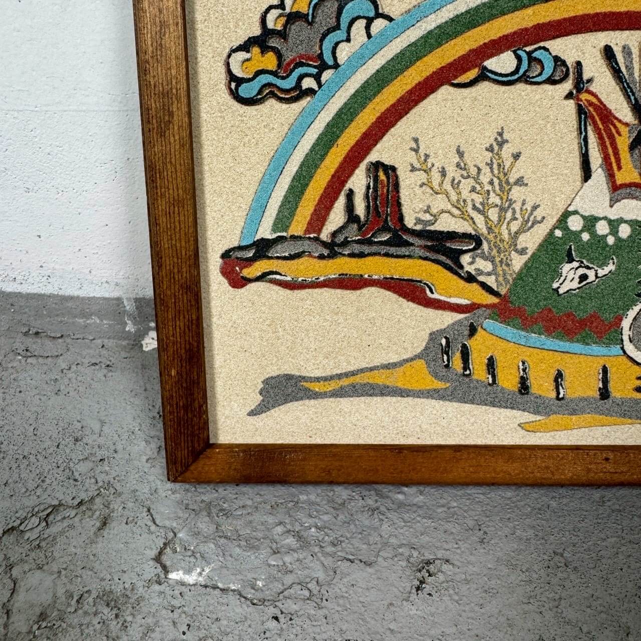 ネイティブアメリカンのティピーや荒野の風景、レインボーをモチーフにしたビンテージのサンドアート作品です。