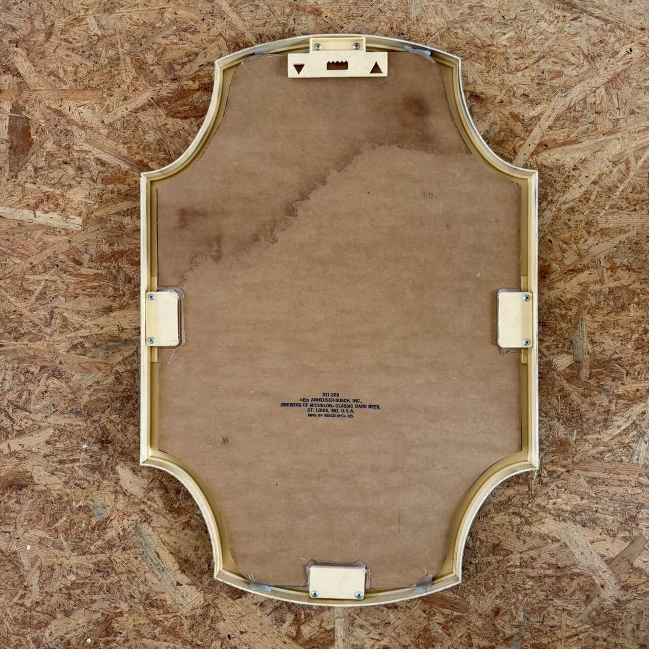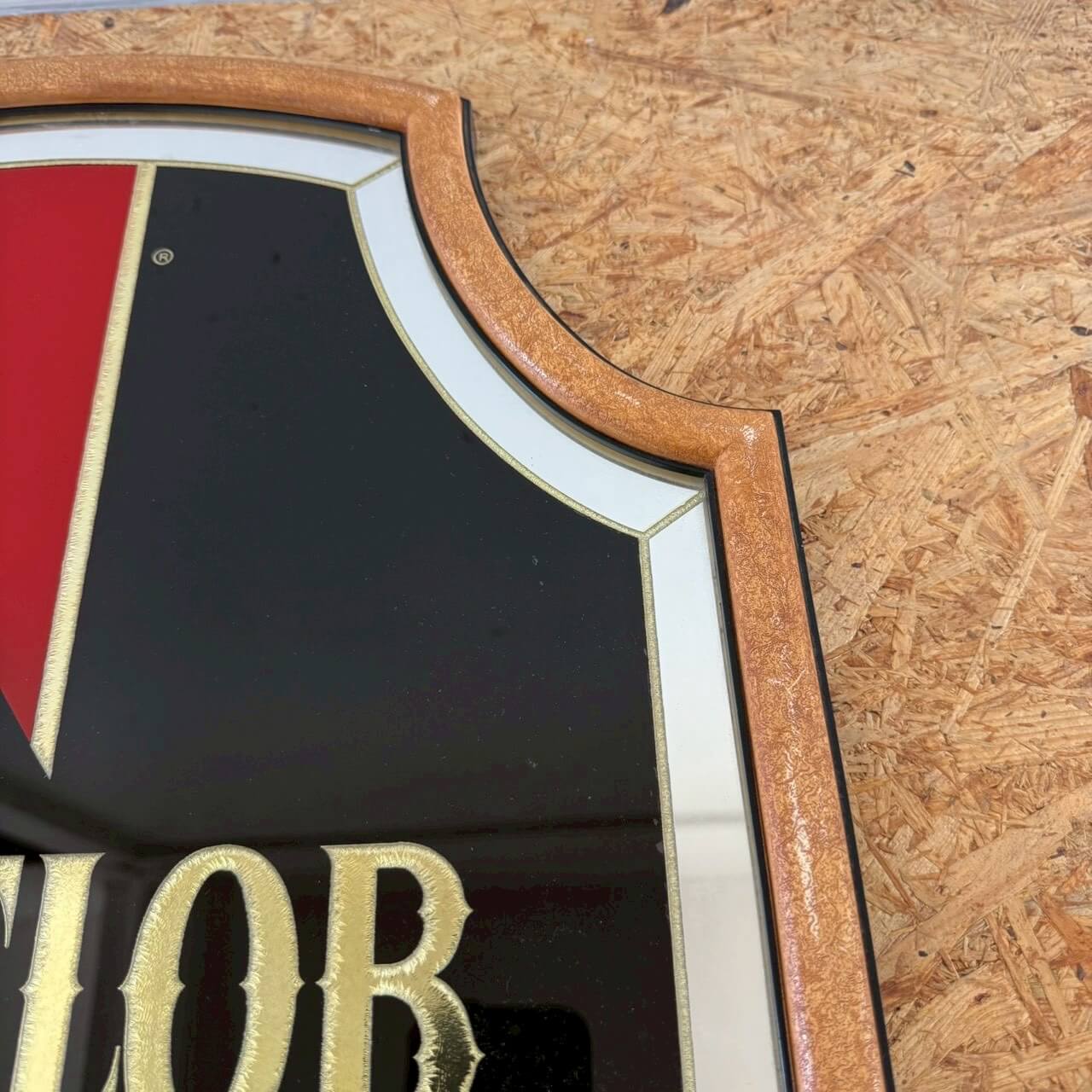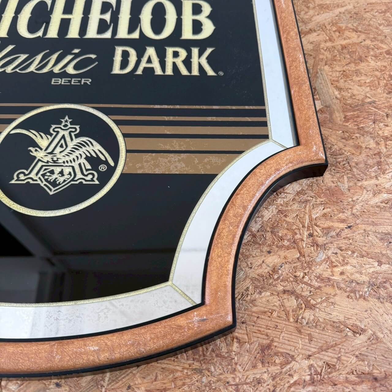 アメリカの老舗ビールブランド「MICHELOB(ミケロブ)」のビンテージパブミラーです。「Classic Dark」のロゴを中心に、ブラックとゴールドを基調とした重厚感のあるデザインが印象的な一枚。さらに、特徴的な曲線を描いたフレーム形状が、一般的なパブミラーとは一線を画す存在感を放っています。